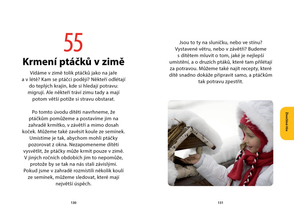 Tato kniha nabízí 100 aktivit, vycházejících z principů pedagogiky Montessori a určených dětem od 3 do 6 let, které jim pomáhají objevovat a pozorovat svět a usměrňují jejich vlastní poznávání a uspokojování jejich nekonečné zvídavosti. Přizpůsobujte je situaci, řiďte se tím, na co má dítě samo chuť - povede vás. Bez ohledu na to, zda žijete ve městě, na venkově nebo jinde, je důležité zajistit, aby měla příroda a živý svět v našem životě své místo. Objevujte svět společně se svými dětmi!