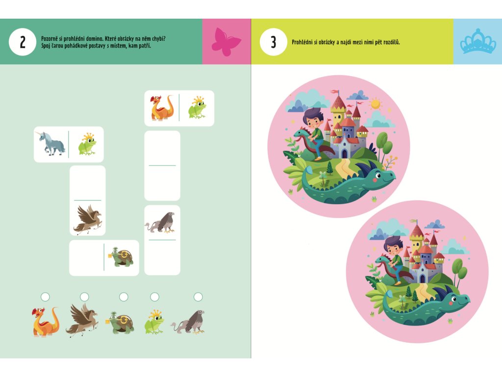 Kniha plná úkolů pro tříleté děti, včetně doplňování logických řad, puzzle, počítání, hledání rozdílů a mnoha dalších.