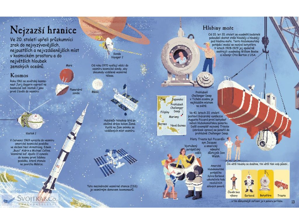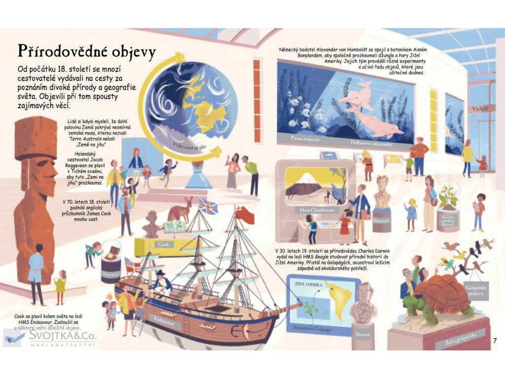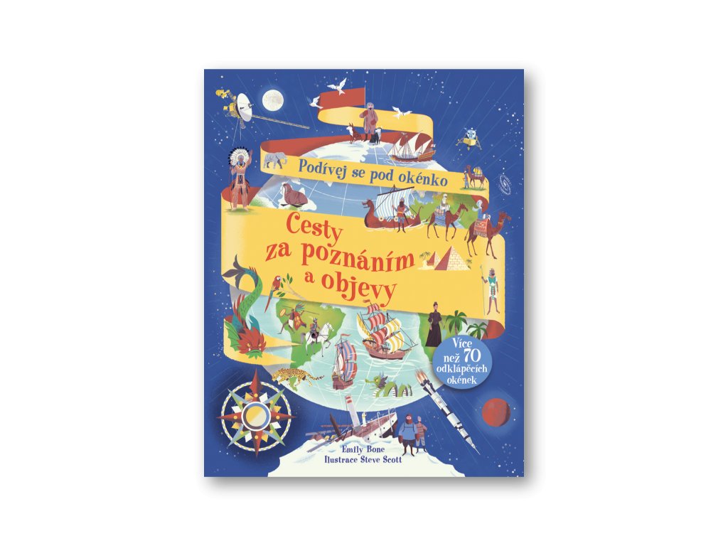 Lidé již po tisíciletí zkoumají svět – aby našli potravu, poklady nebo prostě jen kvůli dobrodružství. Cestovatelé a průzkumníci v minulosti podnikali dlouhé a nebezpečné výpravy za obchodem a poznáním, uskutečňovali první zámořské plavby, vydávali se na cesty do divoké přírody, snažili se svět zmapovat, soupeřili o to, kdo bude první stát na ledových pólech, kdo pokoří nejvyšší horu světa. V době nedávné se snažili jako první vzlétnout do vesmíru, poprvé stanout na Měsíci... Nahlédněte spolu s nimi do neznáma, odhalte, co je pod více než 70 okénky v této knize a vydejte se na cestu za poznáním a objevy!