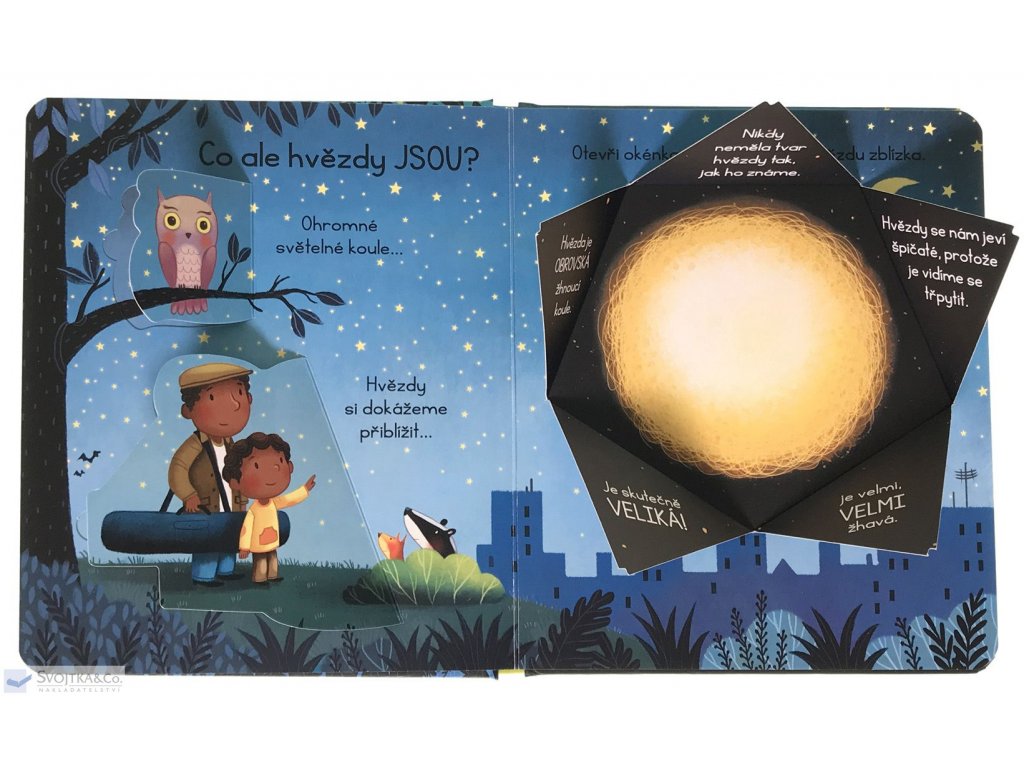 Hvězdy jsou zářivá světýlka na noční obloze. A to je všechno? Kdepak! Hvězdy jsou mnohem víc! S touto bohatě ilustrovanou knížkou s odklápěcími okénky zjistíš, co všechno má tvar hvězdy, která hvězda je k nám nejblíž a proč nejsou všechny hvězdy stejné. Jak přicházejí na svět? Kolik jich na obloze je? A můžu některou z nich navštívit? Odklápěj okénka a poznávej, co jsou to hvězdy.Doplňkové parametry