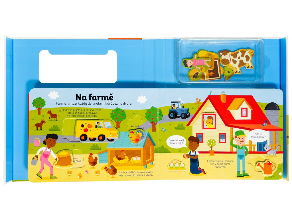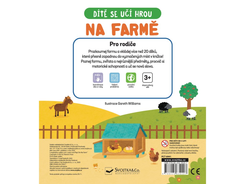 Dokážeš dát všechny dílky na správná místa a dokážeš předměty na farmě pojmenovat? Vesele ilustrovaná knížka nejmenší děti seznámí jak se světem základních slovíček, tak i s různými barvami, ovocem i zvířátky ze statku. Kromě puzzle, díky kterým děti budou rozvíjet a trénovat jemnou motoriku, na malé zvědavce čekají i otázky a úkoly, které jim pomohou si nové znalosti a již nabyté vědomosti o hospodářství procvičit a lépe si je tak osvojit. S knížkou i puzzle se vaše děti na farmě rozhodně nudit nebudou a stráví s nimi celé hodiny hraní a učení plného zvířátek.Doplňkové parametry