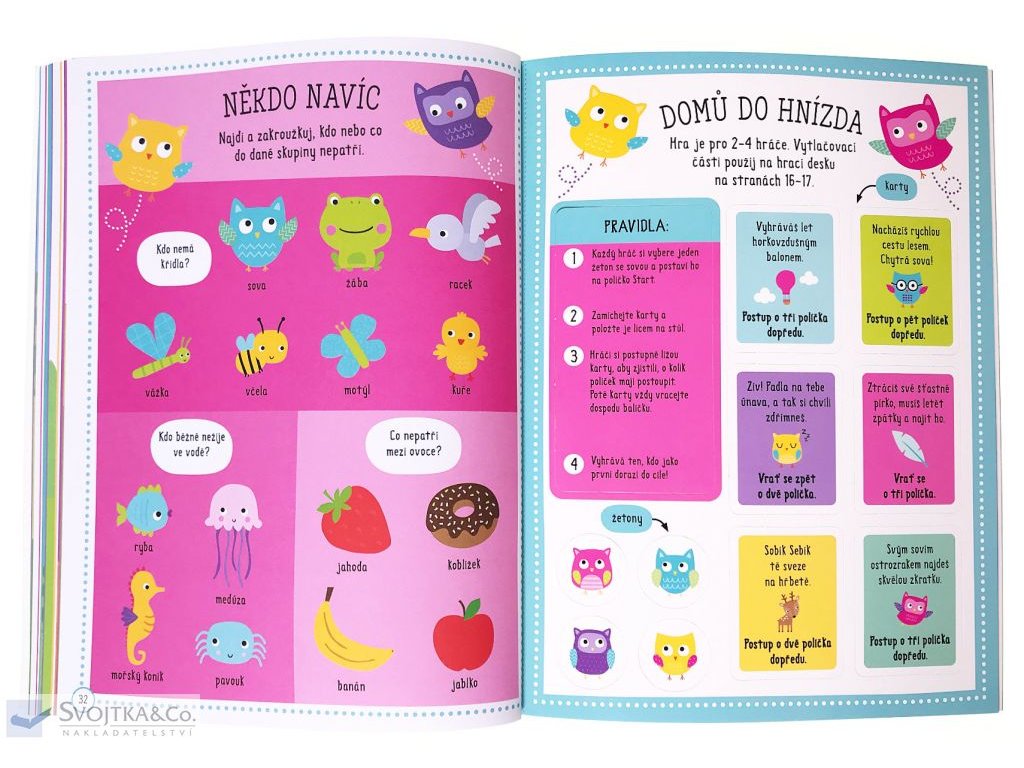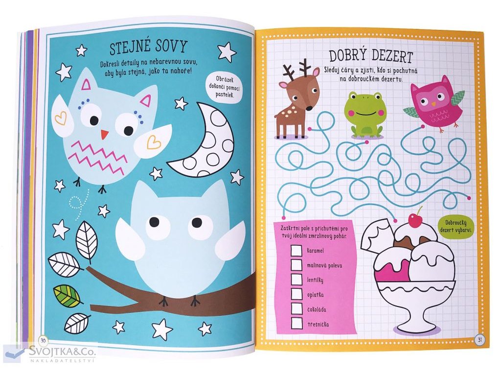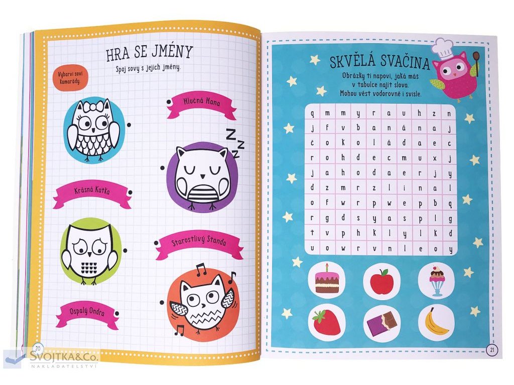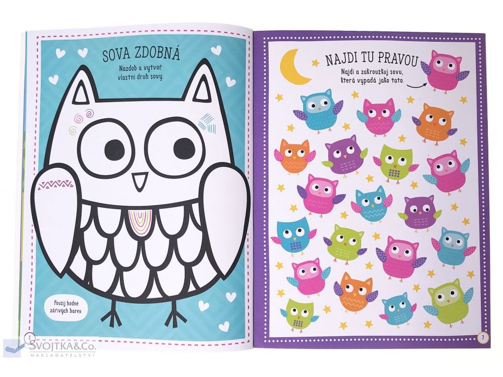 Bav se při plnění aktivit na stránkách této knihy. Moudré sovy budou tvými průvodci. V knize na tebe čeká spoustu zábavných činností, stačí ti jen tužka a barevné pastelky. Více než 100 pěnových nálepek můžeš nalepit do knihy, anebo kam budeš chtít! V zadní části najdeš vytlačovací karty, přáníčka a pohlednice, záložky, poletující sovy a mnoho dalšího. Vytvoř si soví škrabošku a zahraj si na sovu.