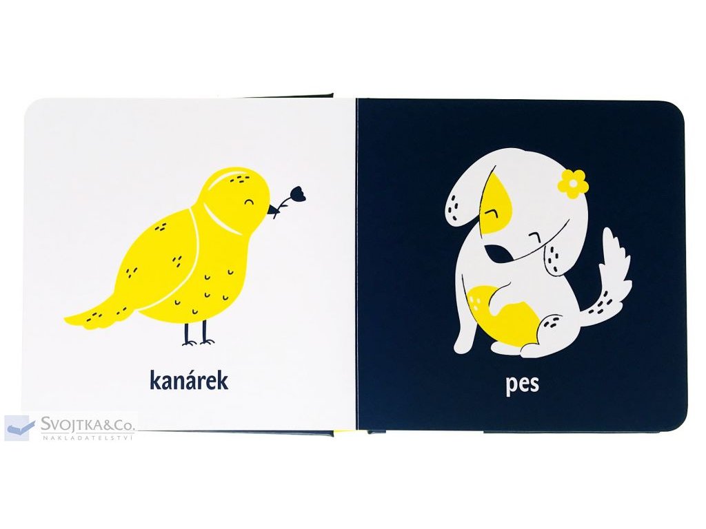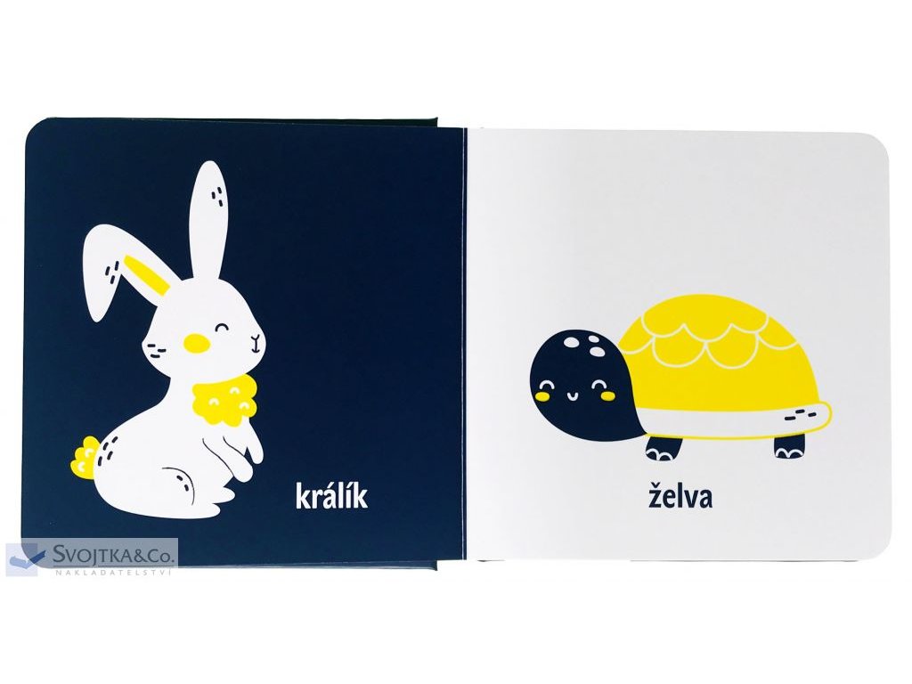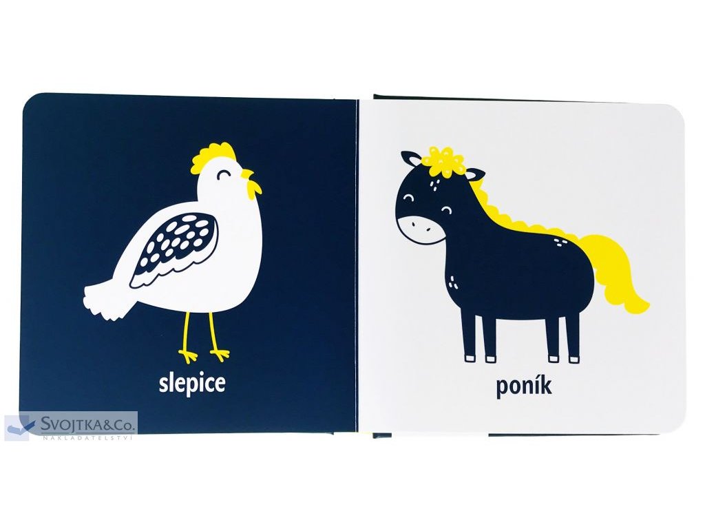 Výrazný černobílý kontrast obrázků s barevnými detaily a jednoduché popisky seznámí děti se zvířecí říší.
