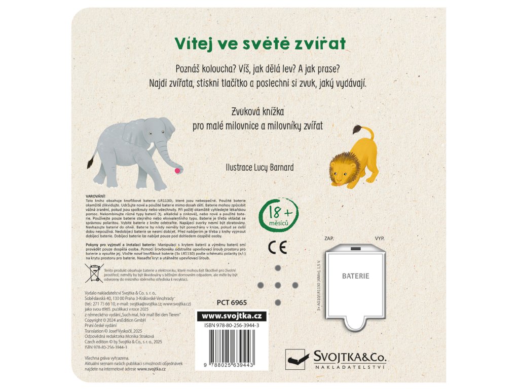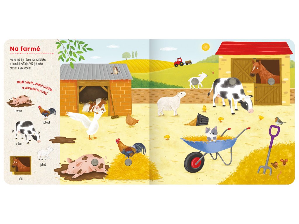 Vítej ve světě zvířat. Poznáš koloucha? Víš, jak dělá lev? A jak prase? Hledej a poznávej zvířata v této zvukové knize s pevnými stránkami v různých prostředích. Najdi zvířata, stiskni tlačítko a poslechni si zvuk, jaký vydávají. Tato roztomile ilustrovaná kniha představí dětem zvířata v jejich přirozeném prostředí a naučí je rozpoznávat podle zvuků.Doplňkové parametry