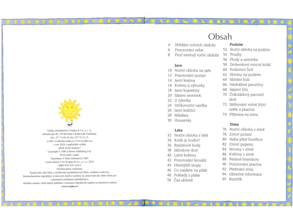 Naučte se ozdobit velikonoční vajíčka, namalovat jarní krajinu, uvařit různé dobroty, vlastnoručně vyrobit sluneční hodiny, vylisovat květiny, uchovat podzimní listí, pěstovat rajská jablíčka nebo pozorovat život ptáků, hmyzu a žab. Zjistěte, jak nakreslit pavoučí síť, jak se zvířata připravují na zimu, jaké brouky můžete spatřit v létě, jak se z pulce vyvine žába a mnoho dalšího. Hrajte si celý rok! S touto inspirující knížkou to půjde snadno a určitě se s ní v žádném ročním období nebudete nudit!