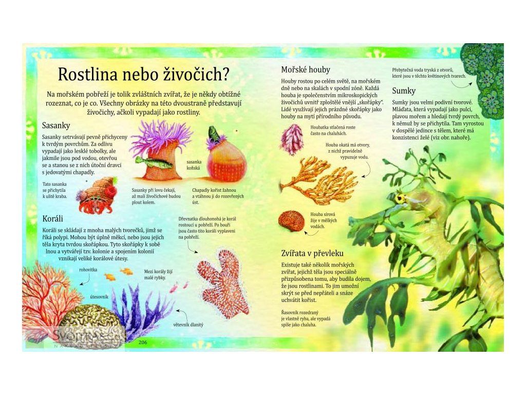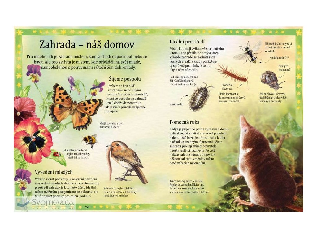 Na venkově, v parku, na zahradě, případně i na pláži se můžete setkat s různými živočichy a spatřit mnoho rostlin a stromů. Jak se ve všech těch druzích, barvách a tvarech zorientovat? Tato knížka se vás to pokusí zábavným způsobem naučit. Poradí, jak nejlépe život v přírodě pozorovat, obsahuje i pár rad, jak udělat co nejlepší fotografie. Ale hlavně v ní najdete velké množství podrobných informací o ptácích, stromech a květinách, hmyzu, slimácích i hlemýždích, motýlech, rybách, lasturách i korýších... Obsahuje velké množství barevných fotografií a realistických kreseb, všechny druhy jsou popsány "od hlavy až k patě"; dozvíte se zde veškeré informace o tom, jak a kde žijí, jak rostou a stárnou, čím se živí, jak se rozmnožují, případně jak pečují o mláďata, jak se mezi sebou "domlouvají", jaké zanechávají stopy, jaký mají tvar těla a zbarvení… Ale i to, jak je máte chránit a jaké o nich kolují mýty a legendy. V knížce se našlo i místo na zajímavosti, které se vám budou zdát neuvěřitelné, pověry spojené se zvířaty či rostlinami a květinovou symboliku. Přejeme vám při pozorování života v přírodě hodně krásných chvil. Stačí se jen pozorně dívat!Doplňkové parametry