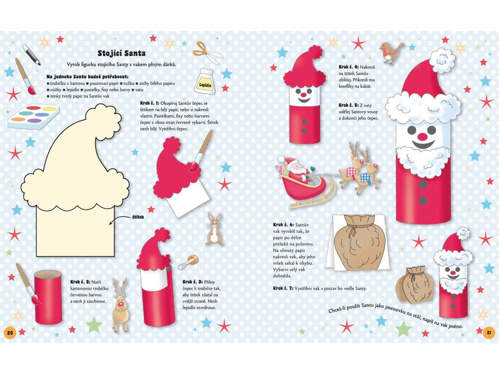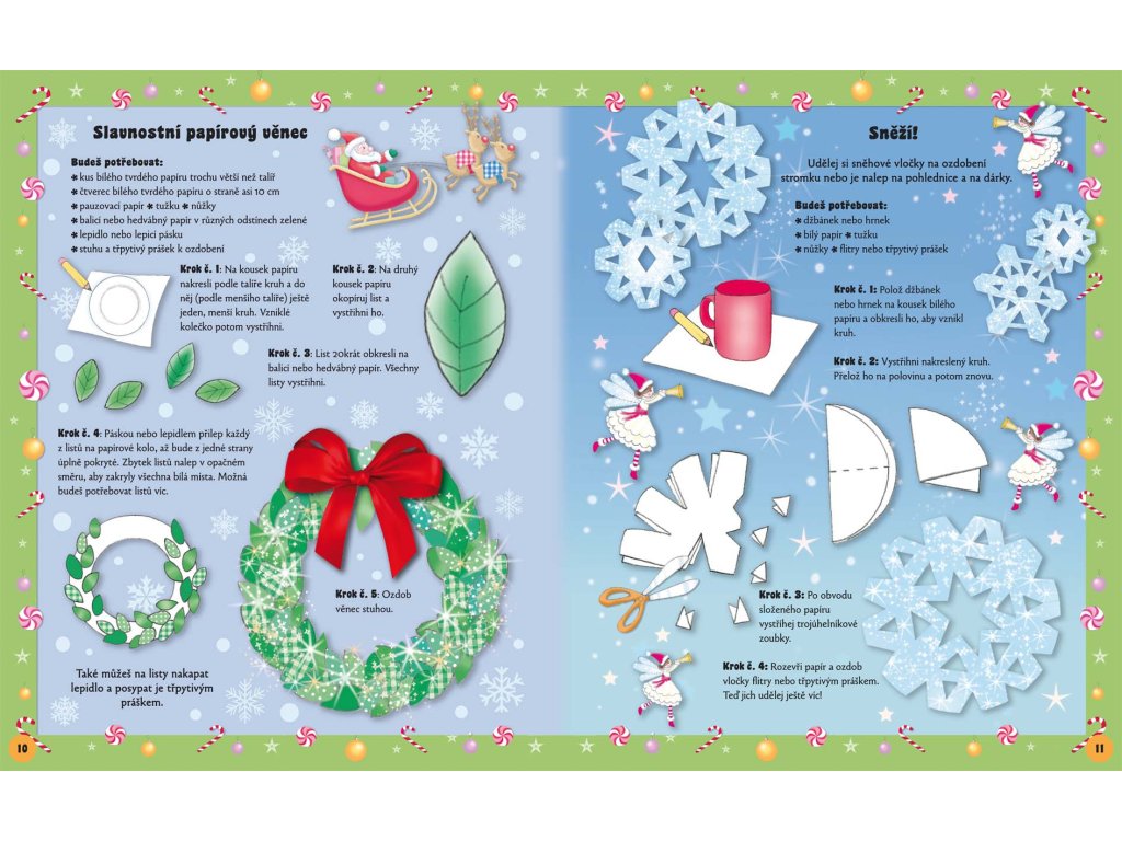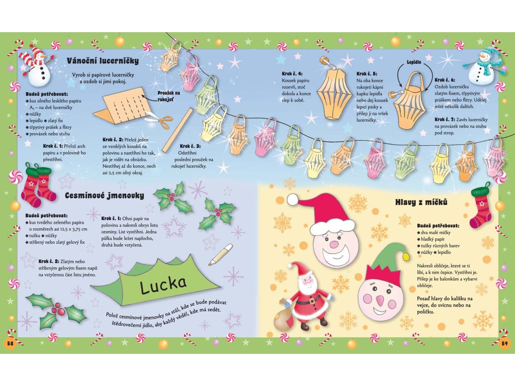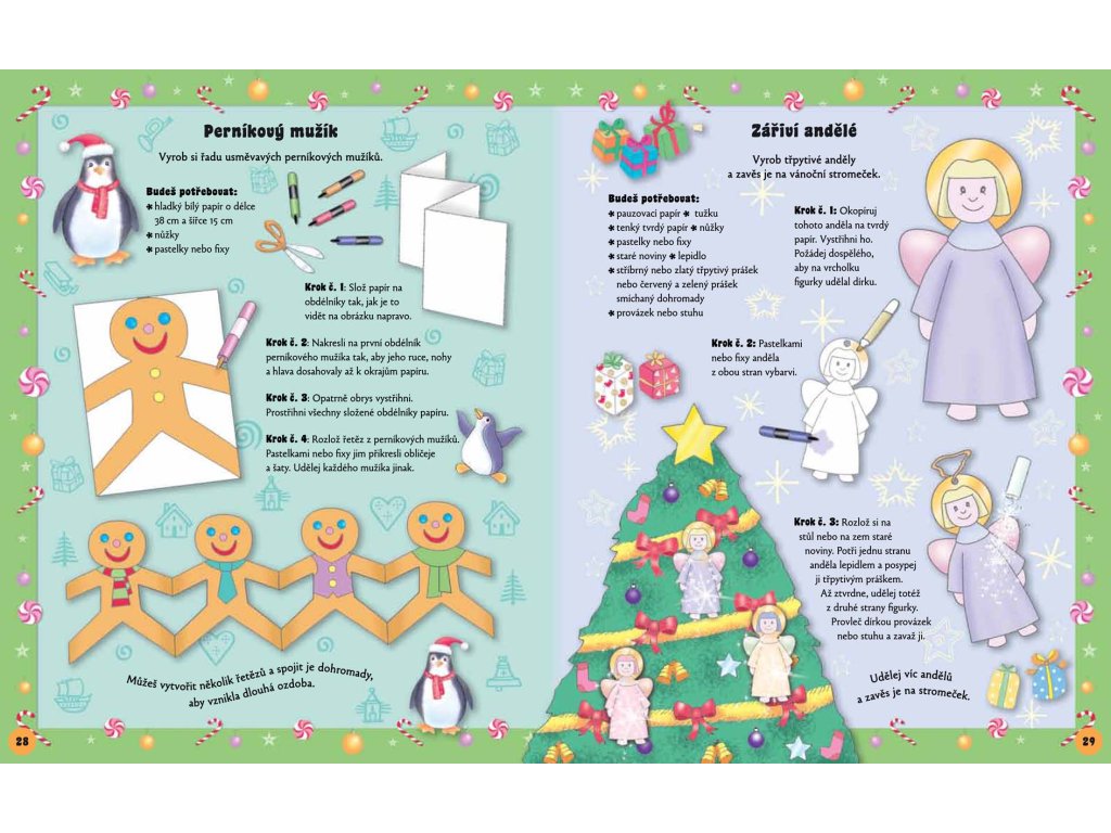 Jak vyrobit papírové řetězy, girlandy, hvězdy na zavěšení nebo hvězdu na špičku stromečku? Jak upéct ty nejlepší vánoční sušenky, sladké cukrové myšky, sušenky zvané sněhové koule nebo cukroví ve tvaru vánočních stromečků? Jak si vyrobit slavnostní papírový věnec nebo ozdobné papírové vločky? Jak snadno vyrobit adventní kalendář? Jak vyhotovit dárkové rámečky na fotografie, originální orazítkovaný balicí papír, vánoční stromky s potpourri, dárkové krabice, ozdobné papírové tašky a blyštivé vánoční pohlednice? Jak udělat veselé vánoční masky? Tato knížka je doslova nabita vánočními nápady a ukáže vám krok za krokem, jak je nejlépe zrealizovat. A kdybyste se přece jen nudili, zahrajte si některou z her, kterou v knížce najdete. Veselé Vánoce!
