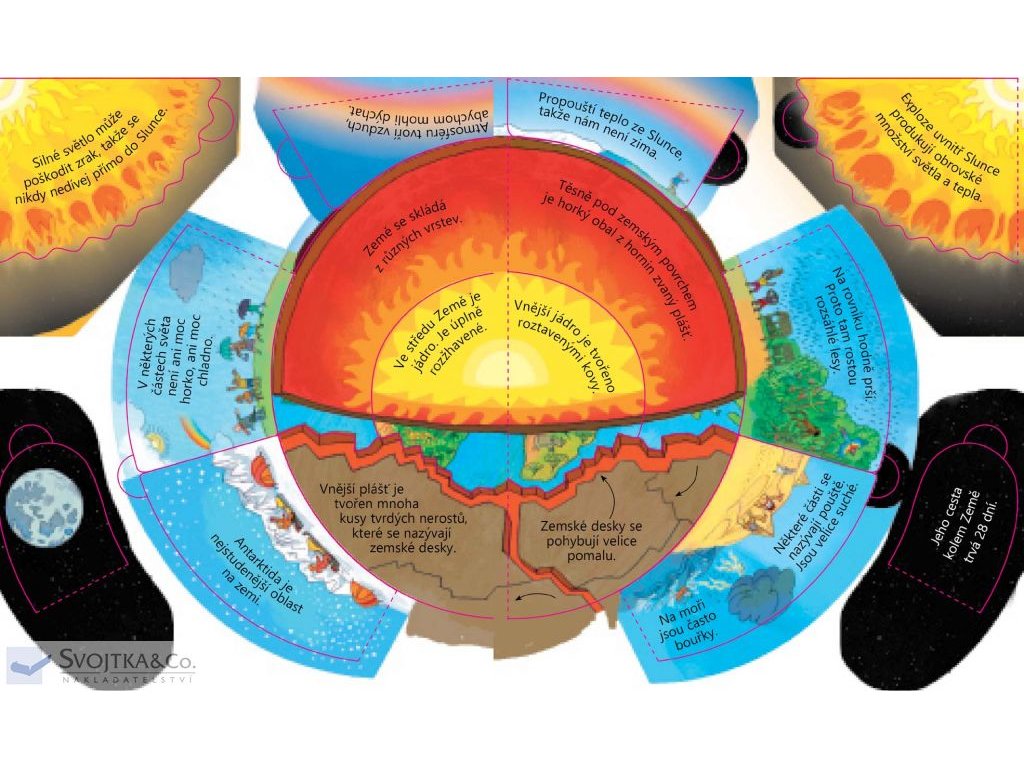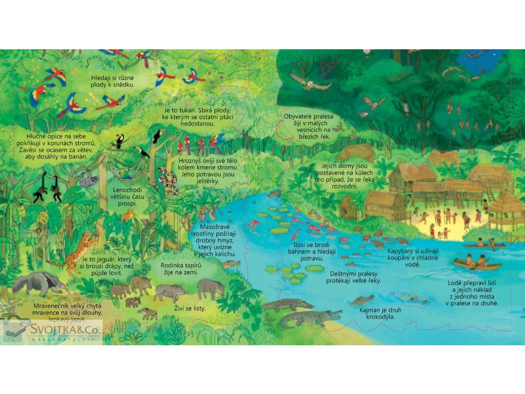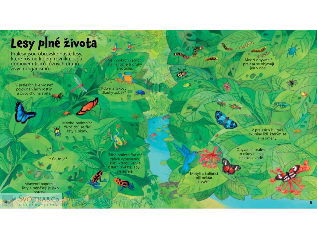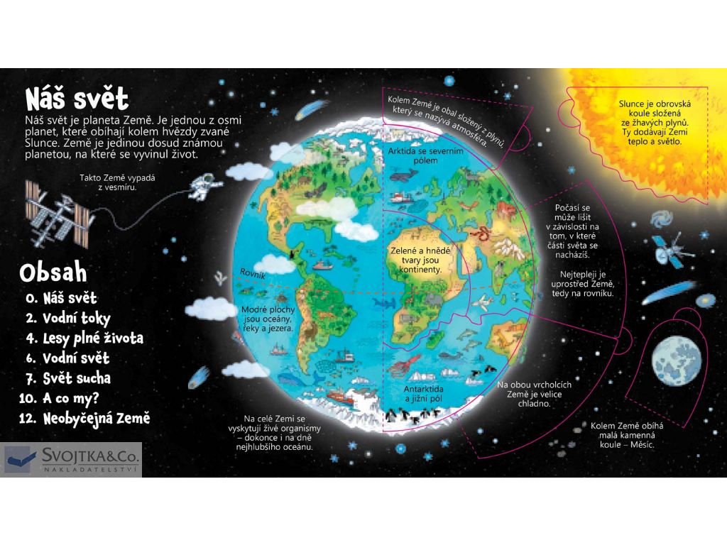 Zjistěte, čím vlastně naše planeta Země je, podívejte se na cestu řek od pramenů až do moře, prozkoumejte, kdo a co všechno žije v deštném lese, v mořích i oceánech, v nejsušších i nejchladnějších částech světa, a objevte ještě mnoho dalších zajímavých informací. Tato encyklopedická knížka s více než 80 odklápěcími okénky se skvěle hodí pro všechny zvídavé děti! Podívejte se tedy pod obrázky a zjistěte, co tam je! Udělejte si chvilku čas a podnikněte s touto knížkou cestu kolem světa, cestu za poznáním!České vydání publikace nakladatelství Usborne.