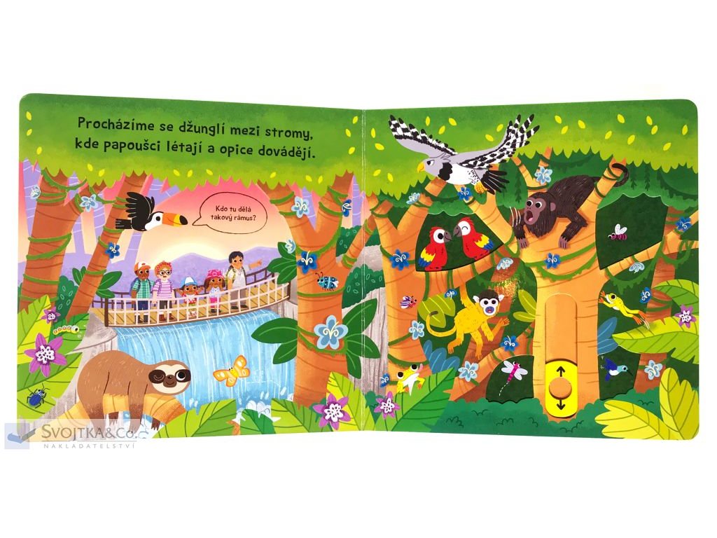 Zajímá tě, jak to žije v džungli? Vydej se na průzkumnou výpravu do pralesa. Poznej pestrobarevné papoušky, krásné kapybary, obdivuhodné orangutany a silné slony. Pojď prozkoumat džungli s tímto leporelem s krásnými verši, které pobaví a poučí každého malého zvědavce. Leporelo má pevné stránky s posuvnými a otočnými prvky, a tak si vaše ratolest procvičí i jemnou motoriku. Tlač, tahej, posouvej a hlavně se bav!Doplňkové parametry