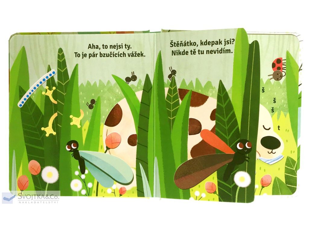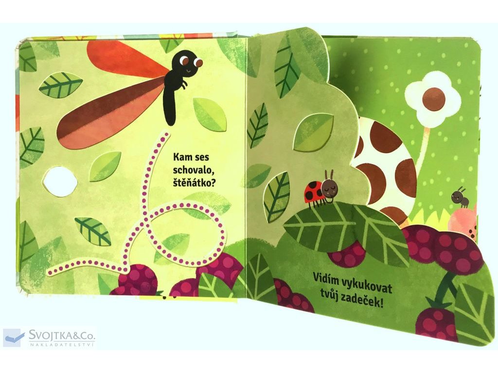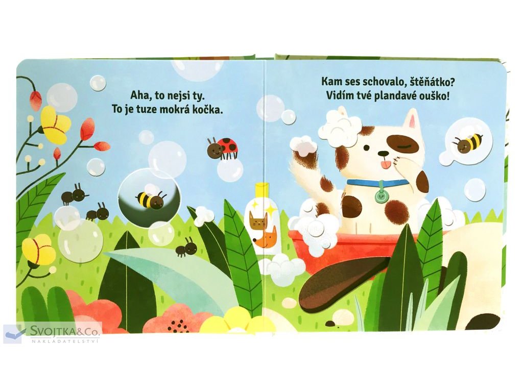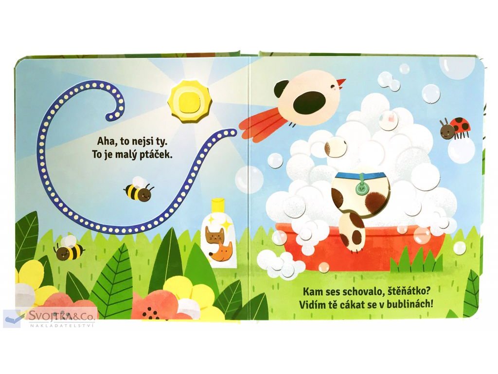 Kniha pro nejmenší děti, která jim jistě udělá radost. Užijte si společné chvíle při listování knihou a hledejte roztomilé štěňátko. Cáká se v bublinách? Odkud vykukuje jeho plandavé ouško? Kam se schovalo tentokrát? Děti jistě potěší, že mohou nakukovat skrz výřezy do dalších stránek. Šikovně umístěné výřezy navíc dávají obrázkům nový rozměr – možná není vše na obrázku takové, jak se to na první pohled zdá. Kniha je vytvořena z pevného materiálu, který vydrží i neopatrné zacházení malých nezbedníků. Tak hurá do objevování!