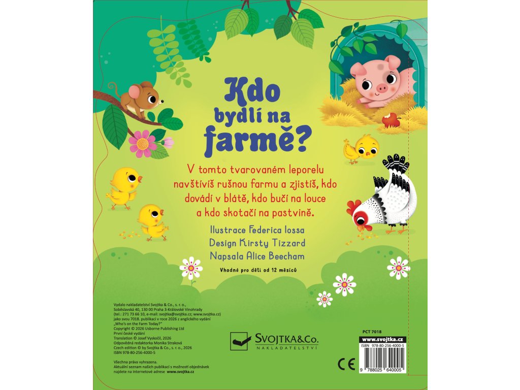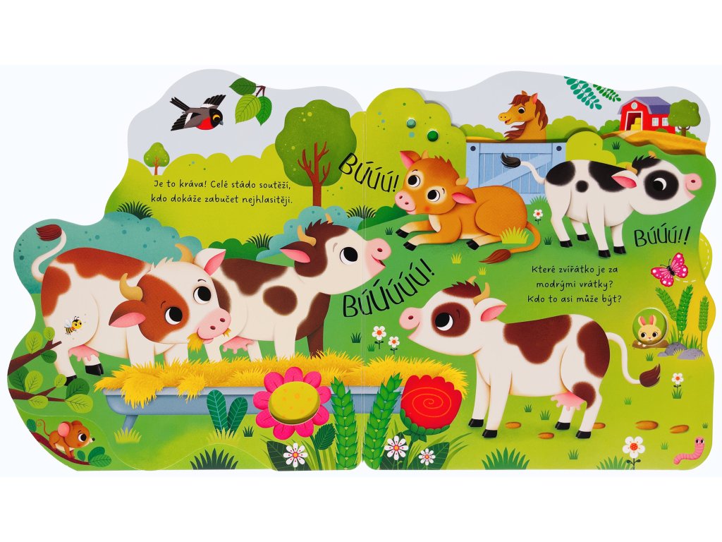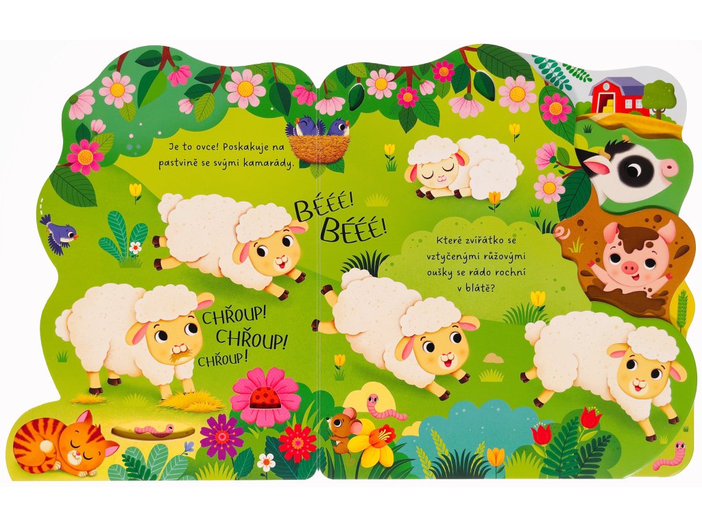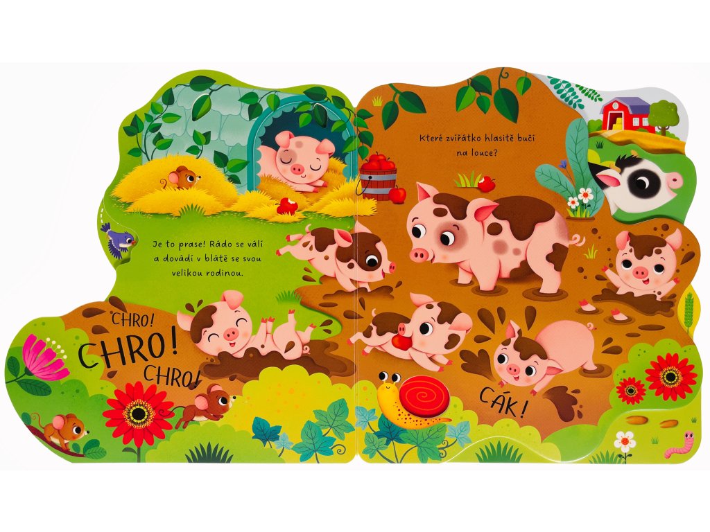 Navštiv farmu a poznej veselá zvířátka. Leporelo má různě tvarované stránky, které pomohou malým dětským prstíkům se snadným otáčením a také zaujmou zvídavé hlavičky! Ze stránek vykukuje kravička, prasátko i ovečka. Zjisti, kdo si pochutnává na zrníčkách, kdo stojí před stájemi nebo kdo hýká v ohradě. Hravě řešené leporelo s výřezy a tvarovanými stránkami představí dětem farmu a nejrůznější zvířata.Doplňkové parametry