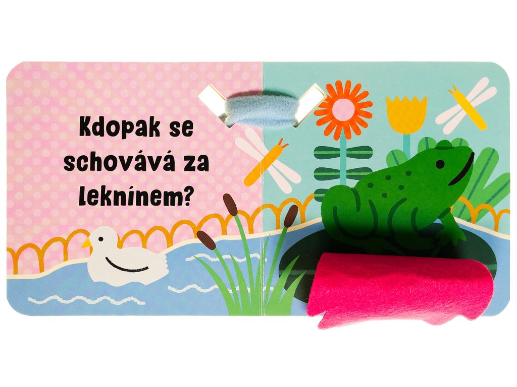 Mini knížka pro nejmenší s plstěnými okénky, k zavěšení přímo na kočárek. Hledání ukrytých zvířat pro rozvoj zraku a hmatu miminek.