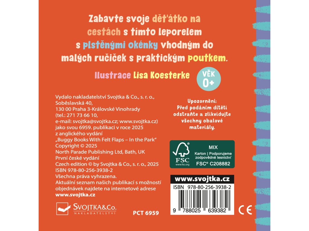Tato menší knížka s plstěnými okénky zaujme nejmenší děti. Díky vhodné velikosti a měkkým okénkům leporelo napomůže s rozvojem zraku, hmatu i motorických schopností. Děti se seznámí se zvířátky, které mohou potkat na procházce, a praktické poutko zajistí, že knížečka bude miminku vždy po ručce.Doplňkové parametry