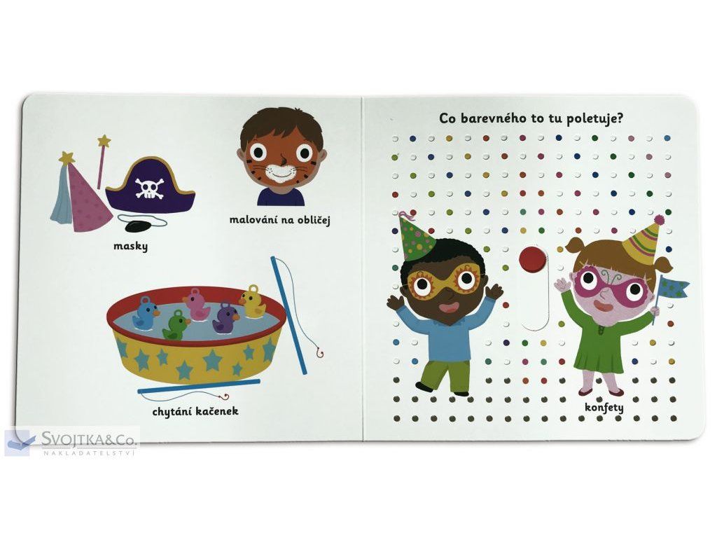 Objevovat, co všechno lze vidět na narozeninové oslavě, je s tímto leporelem tak zábavné! Co barevného si nafoukneme? Co zapálíme oslavenci na dortu? Stačí jen vložit prstík do správného otvoru, lehce posunout nebo otočit ve směru šipky a hned bude váš malý objevitel nebo objevitelka znát odpovědi. Leporelo je určeno pro nejmenší děti od jednoho roku a má pevné stránky s posuvnými prvky, a tak si naši nejmenší mohou při prohlížení a pojmenovávání procvičit i jemnou motoriku. Knížka s prvky Montessori.České vydání publikace nakladatelství Nathan.