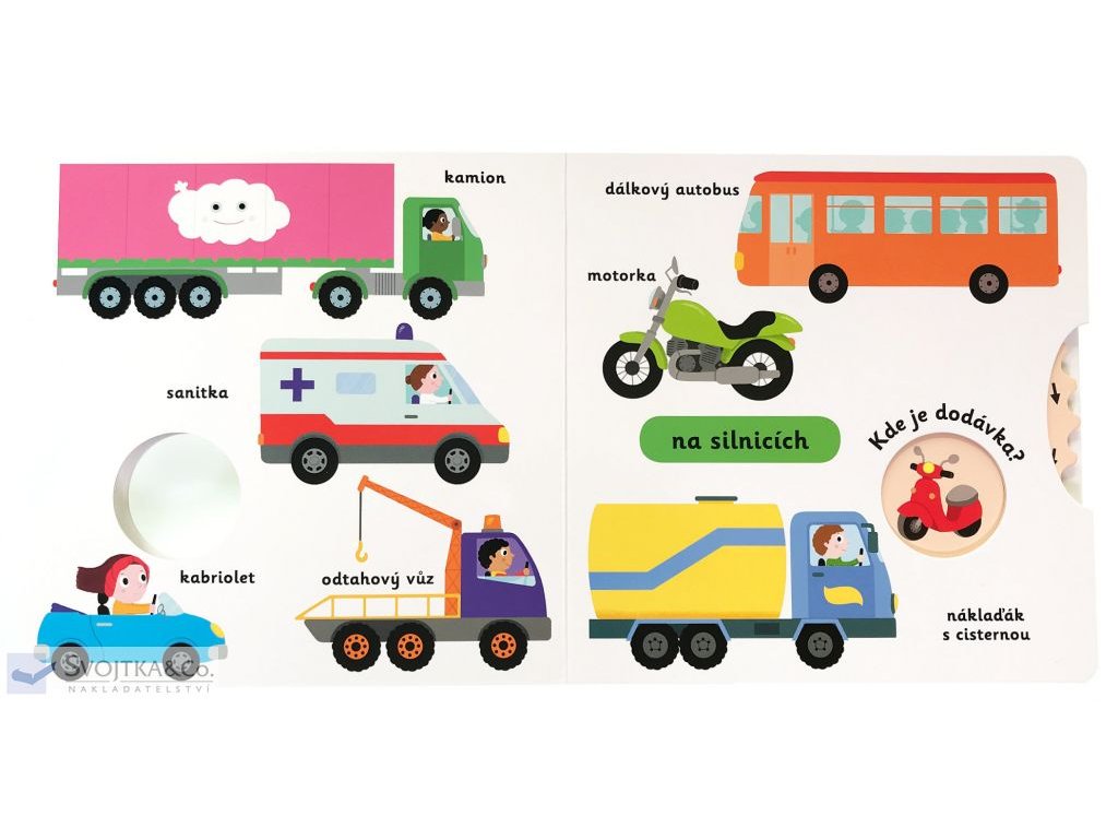 Tahle auta znám, ta nám jezdí pod okny! Ale kde jezdí tramvaj a metro? Koho vozí dálkový autobus a co se míchá v té velké hlučné cisterně na stavbě? Pro všechny malé milovníky rychlých kol je tato knížka jako dělaná. Nestačí však dopravní prostředky obdivovat, je třeba je také umět správně pojmenovat. Jaký je rozdíl mezi raketou a letadlem? Víš, co je lanovka nebo šlapadlo? Prohlížejte si s dítětem jednoduché obrázky ve stylu MiniPEDIE a pomocí otočného kolečka spolu hledejte správné vozidlo. Knížka pro nejmenší rozvíjí slovní zásobu a jemnou motoriku.Knížka s prvky Montessori