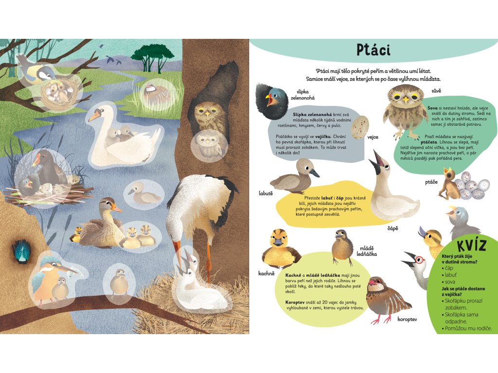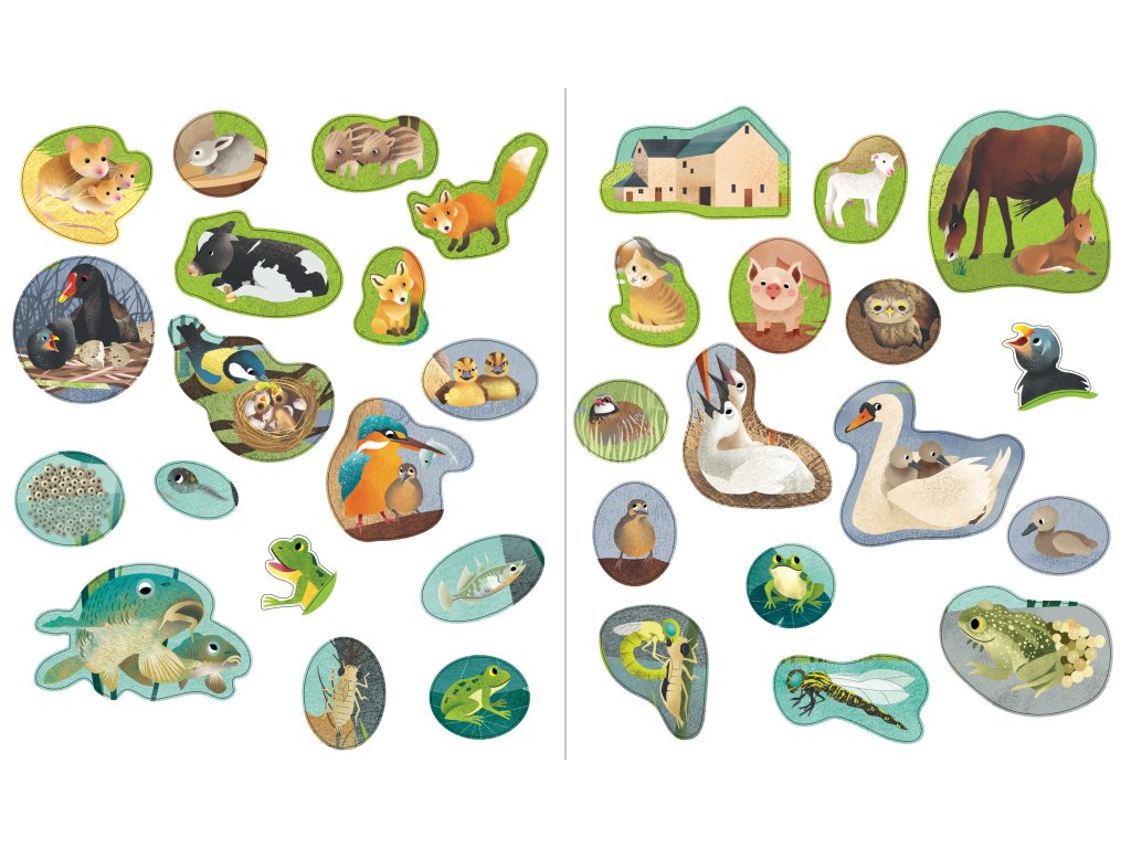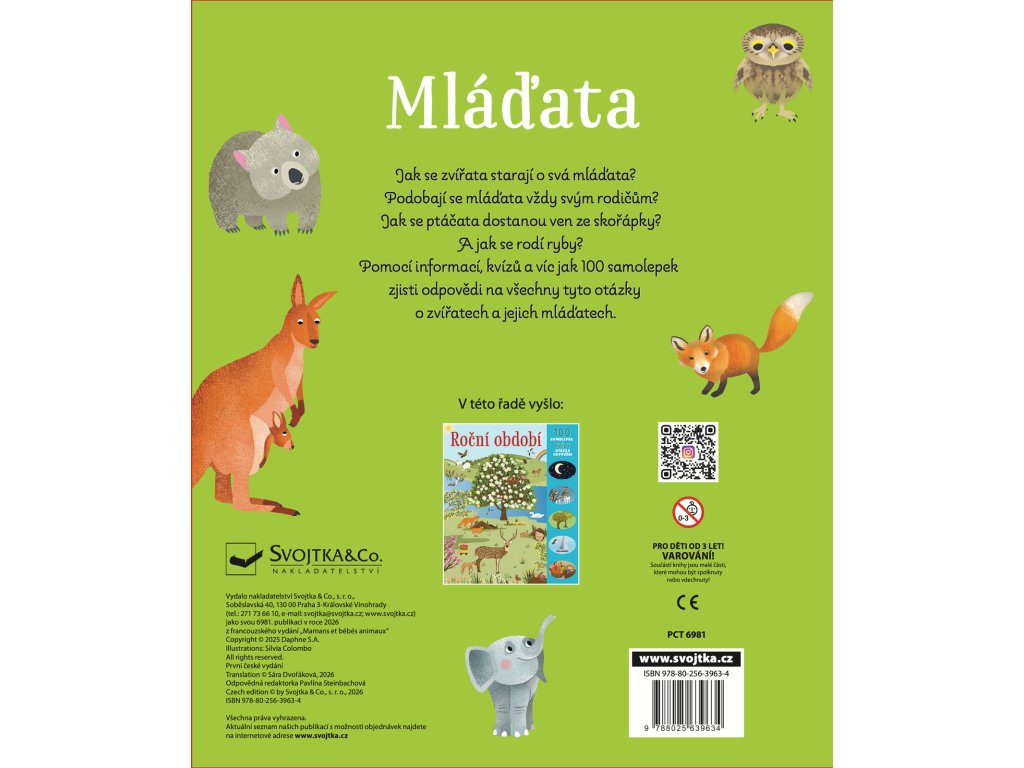 Kniha se samolepkami nabitá informacemi o mláďatech rozšíří obzory nejednomu malému nadšenému přírodovědci. Každá dvoustrana obsahuje celostránkovou ilustraci, kam se lepí samolepky, dále plno informací o savcích, ptácích, vačnatcích, hmyzu, zvířatech v polárních oblastech a mnoho dalších. Následuje kvíz pro zopakování si nových poznatků. Propracované obrázky, zajímavosti ze světa zvířat, kvízy a 100 samolepek k nalepení do obrázků, to vše nabízí tato knížka, která je dokladem toho, že i učení může být zábavné.Doplňkové parametry