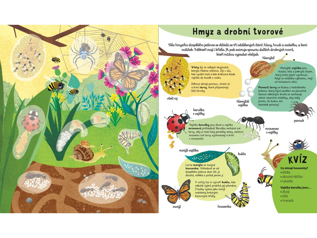 Kniha o přírodě nabízí propracované obrázky, zajímavosti o čtyřech ročních obdobích a proměnách přírody, kvízy a samolepky k nalepení.