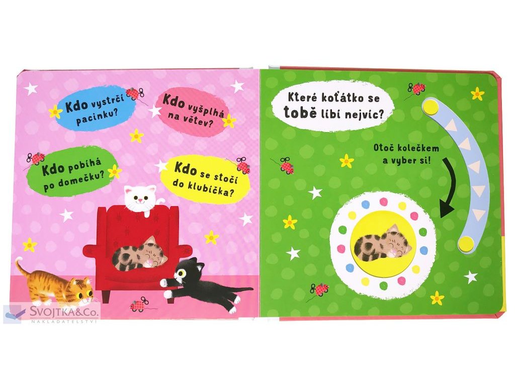 Koťáka jsou prostě všude. Jedno pobíhá po domečku, druhé šplhá na větev. A kdopak se to stočil do klubíčka? No jistě, další malá kočička! Je vaše dítko také blázen do zvířat, do koček obzvlášť? Pořiďte mu toto leporelo s pohyblivými prvky, kde najde několik koťátek, z nichž si může vybrat to nejoblíbenější. Barevné ilustrace doplňují jednoduché verše.Doplňkové parametry