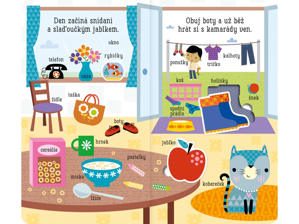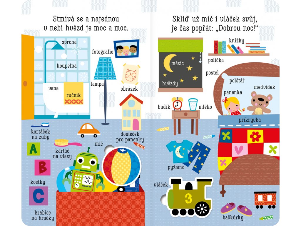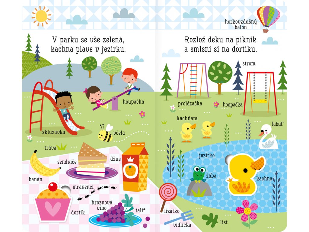 Vyjmi vkládačky z titulní strany a najdi pro ně to správné místo uvnitř knihy! Vhodná pomůcka pro vytváření asociací mezi slovem a obrázkem a procvičování jemné motoriky. Obsahuje osm pevných vkládaček, tvarem a velikostí akorát pro dětské ručky, jednoduché verše pro děti a čtyři dvoustrany - celobarevné scenérie plné barevných obrázků s popisky. Najdi, kam patří: kachňátko, jablíčko, balón nebo vláček.Doplňkové parametry