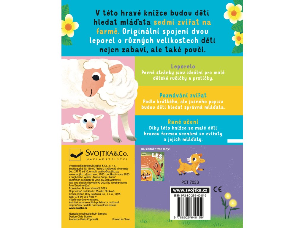 V tomto originálně zpracovaném leporelu čeká na děti zábava i poznání. Díky propojení dvou leporel o různých velikostech budou děti na základě jasného a krátkého popisku hledat správná mláďata zvířat na farmě. Pevné stránky jsou ideální pro malé ručičky a dělají z této knihy perfektního parťáka pro jedno z prvních seznamování se světem zvířat. Malé děti si procvičí jemnou motoriku a prstíky, poznají první slůvka a seznámí se zvířaty a jejich mláďaty.Najdi mládě Farma