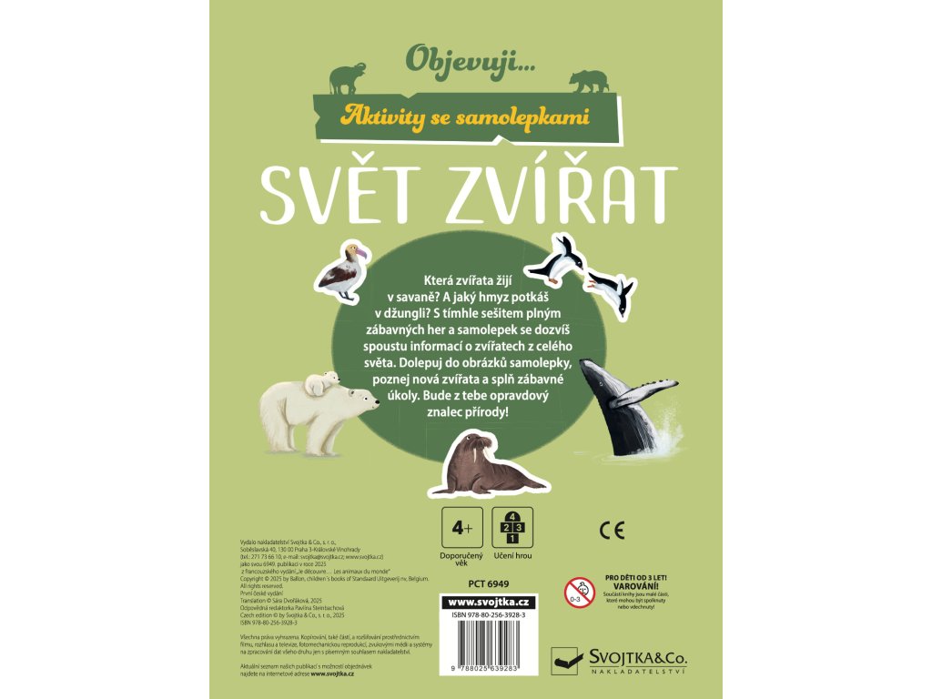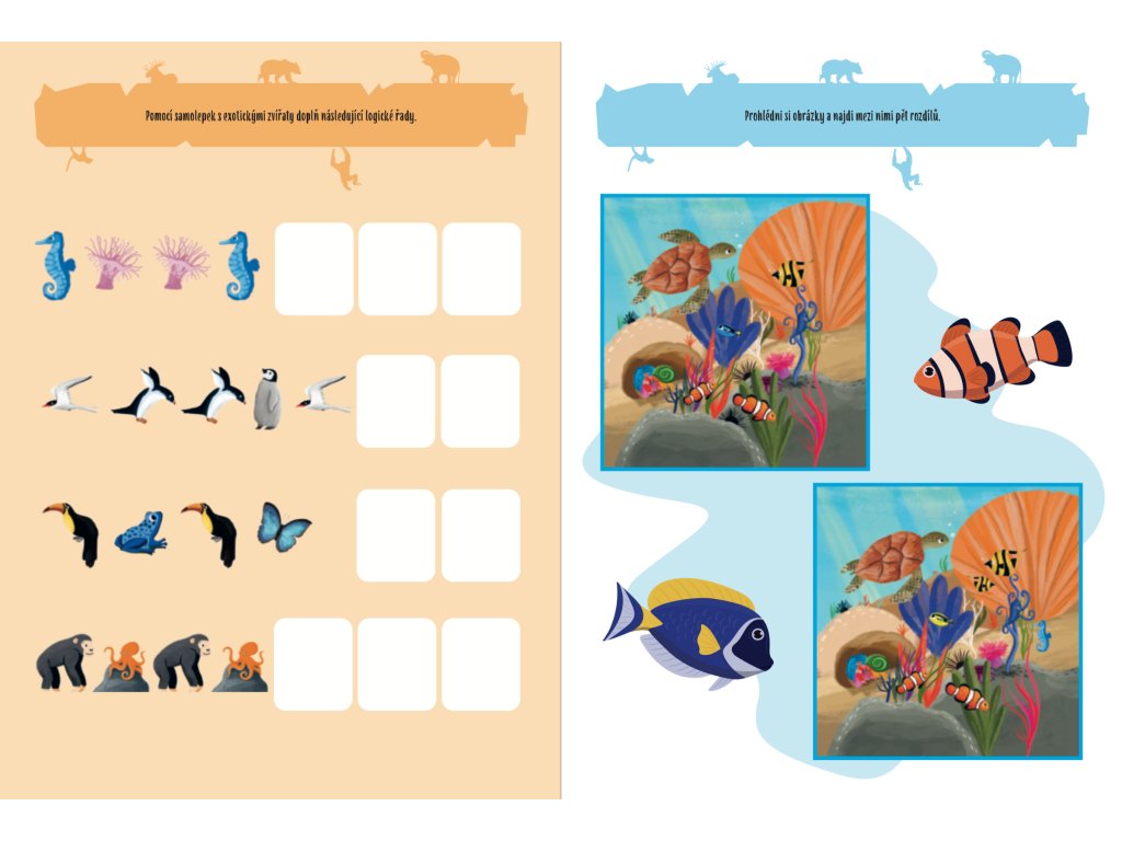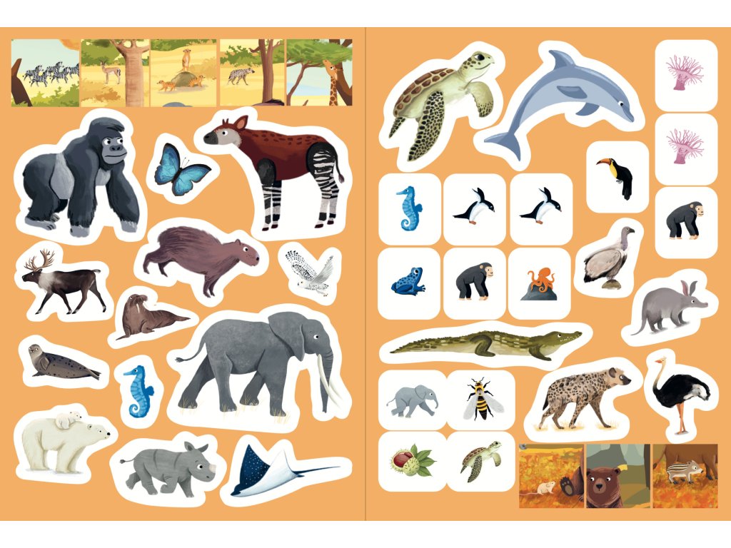 Pomocí znovupoužitelných samolepek dokonči scenérie a poznávej zvířata z celého světa. Vyjmi extra sešit a pusť se do nalepování. Zábava právě začíná!