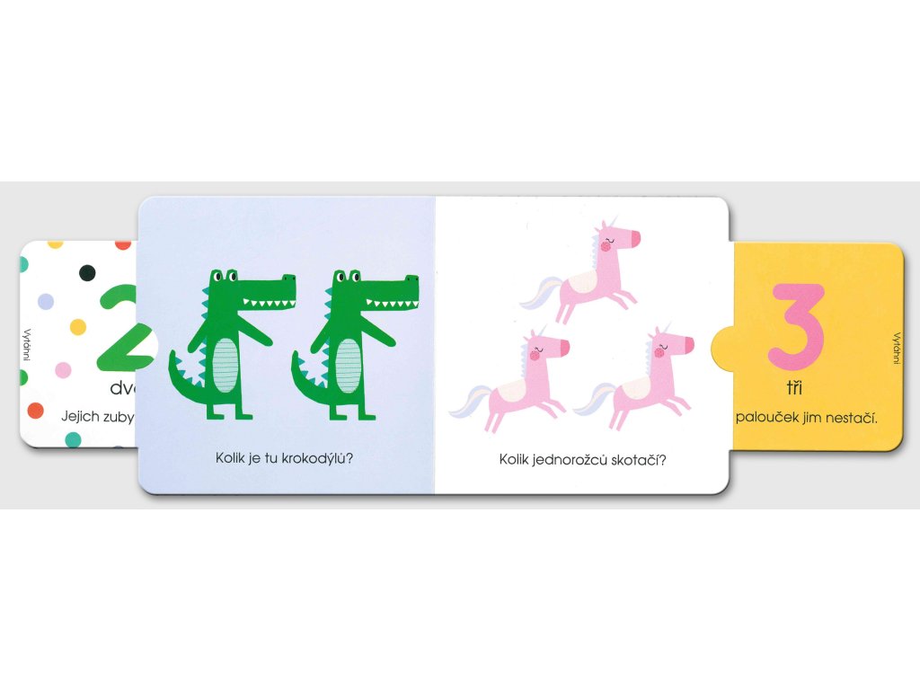 Kolik je tu krokodýlů? Dva! Jejich zuby mají sílu. Umíš spočítat, kolik věcí je na každé stránce? Vytáhni z boku stránky kartičku a přesvědči se, zda je tvá odpověď správná. Mile ilustrovanou knížku doplňují jednoduché verše zaměřené na rozvíjení slovní zásoby a počítání od jedné do deseti.