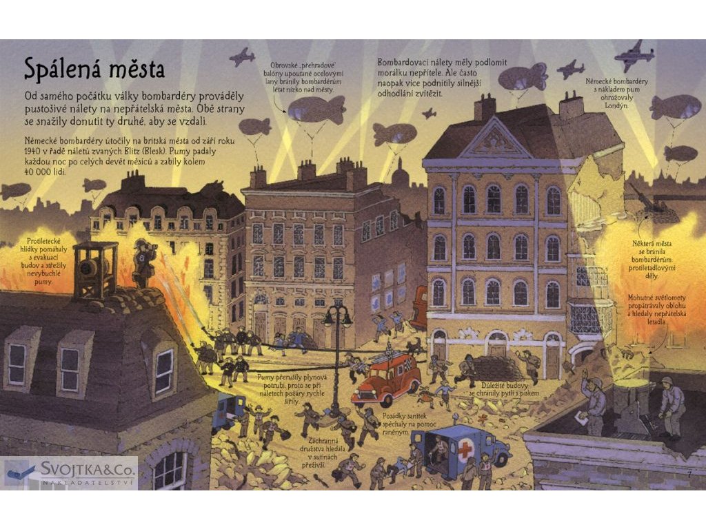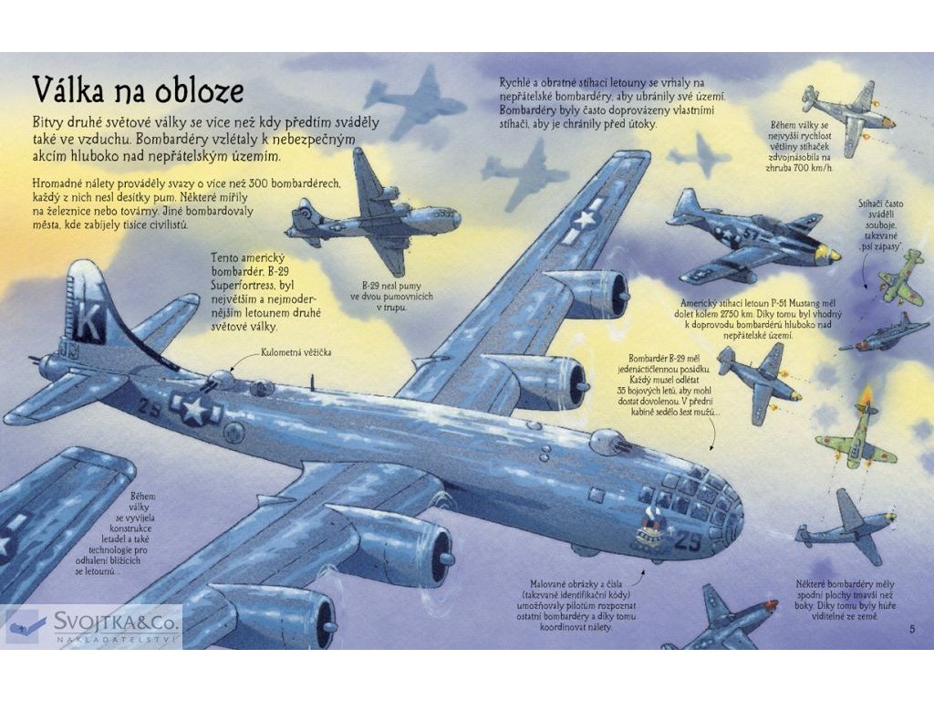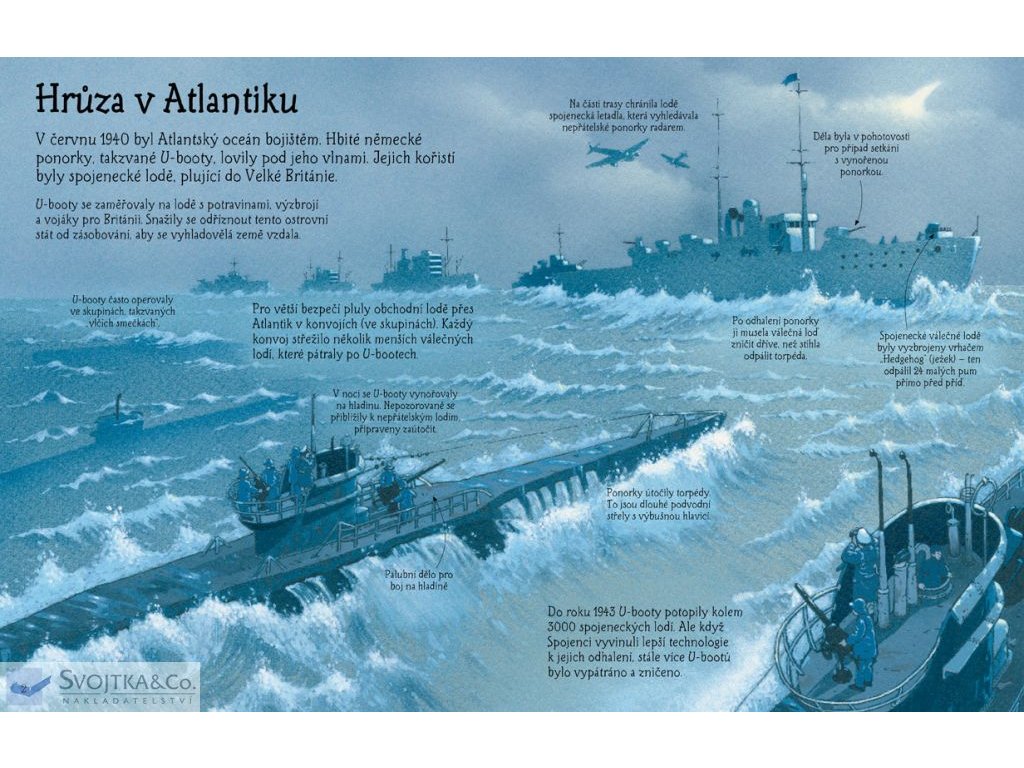 V září 1939 vtrhla německá armáda do Polska a tím začal nejkrvavější válečný střet v dějinách. Boje se odehrávaly na souši, ve vzduchu i na moři. Na bojištích rachotily tanky, ponorky pronásledovaly bitevní lodě a bombardéry ničily města. Víš, že německé ponorky operovaly ve skupinách, takzvaných vlčích smečkách? Víš, že se v den D na pěti francouzských plážích vylodilo kolem 50 000 vojáků? Chceš se o tomto konfliktu, který si vyžádal 60 milionů lidských životů dozvědět? Tato encyklopedická kniha s mnoha informacemi, živými ilustracemi a více než 70 otevíracími okénky tě zavede přímo do bojů druhé světové války.