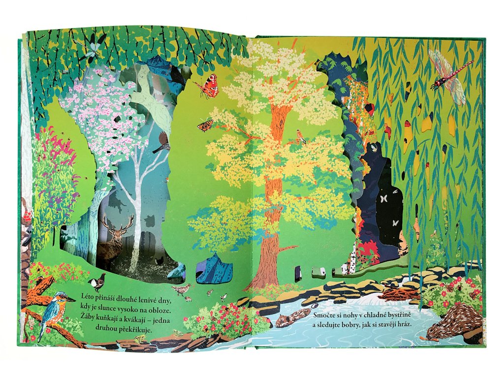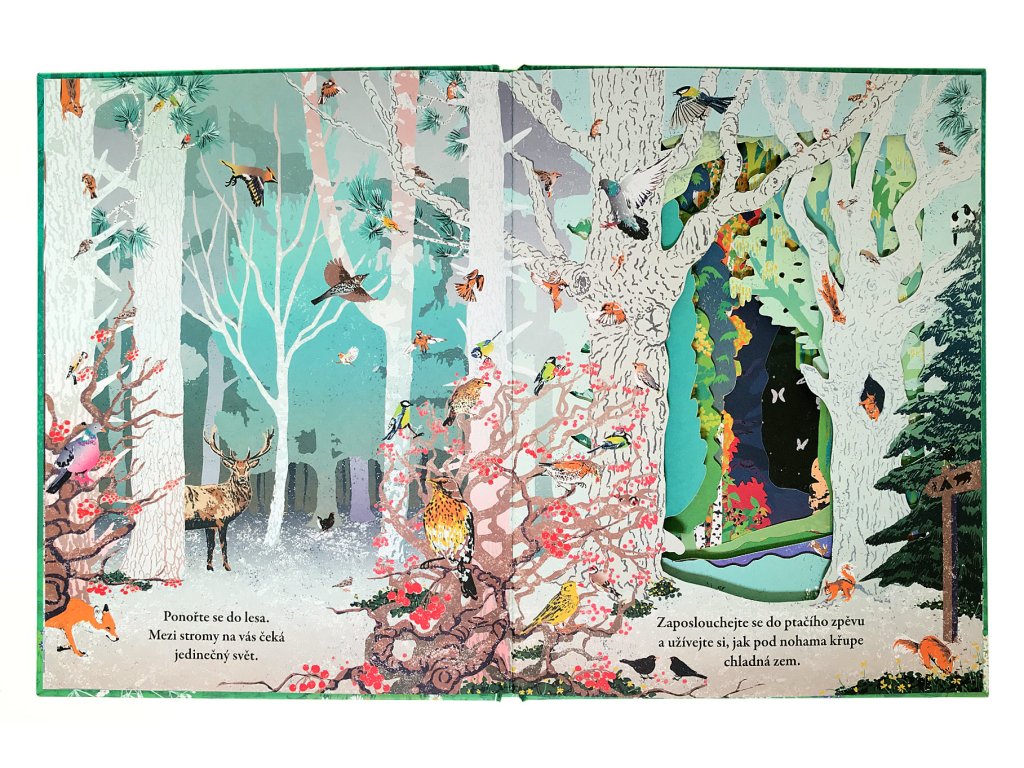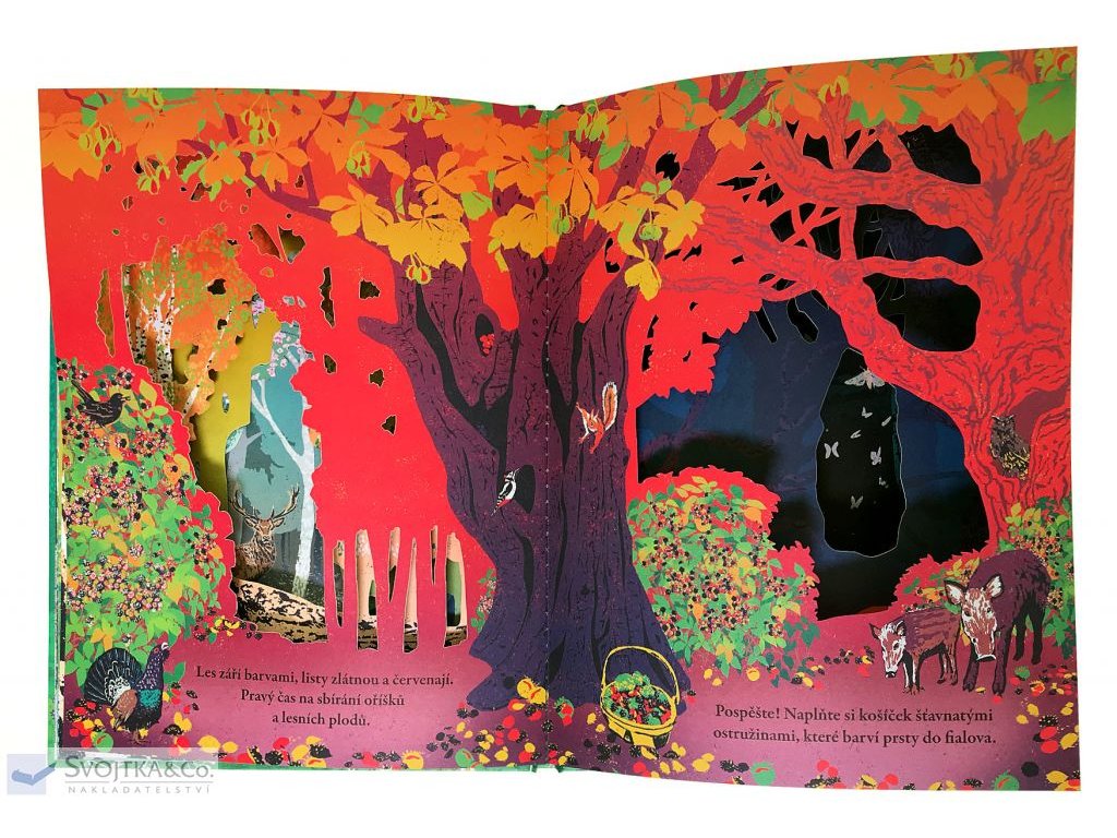 Les je tichý, klidný, hluboký a neměnný... Ale skrývá se v něm také plno života! Zejména, když se mění roční období, proměňuje svou tvář i les. Ponořte se do něj v této úchvatné knížce s průhledovými výřezy. Objevujte nádherné detaily ve scenériích, které se před vámi postupně odkrývají. Koloušek hledá svou maminku, veverky shánějí plody a oříšky na zimu, bobři stavějí hráz a zpod listí vykukují klobouky hub. Mezi tím vším jste vy coby nenápadní pozorovatelé nikdy nekončícího lesního dobrodružství. Za večerů se můžete ohřát u táboráku a v zimě spočinout ve srubu. Ale příliš neotálejte; v lese je toho stále spousta k objevování!