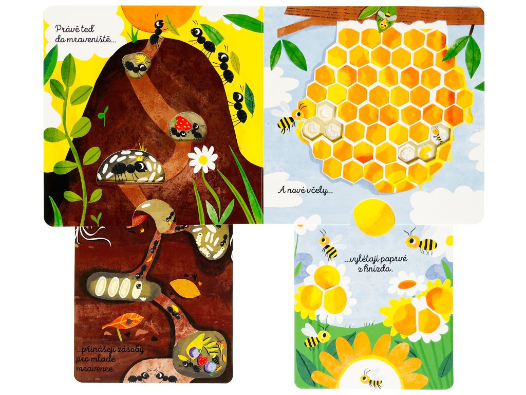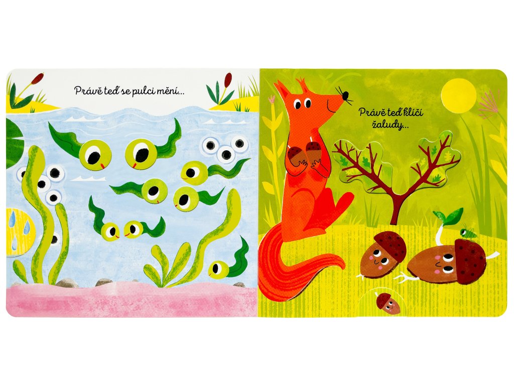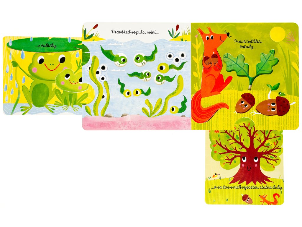 Tato kniha je krásně ilustrovaným interaktivním leporelem pro malé čtenáře, které je zavede do fascinujícího světa přírodních proměn. Sledujte s vašimi nejmenšími, jak se pulci mění v žáby, žaludy klíčí v mohutné duby a housenky se proměňují v pestrobarevné motýly. Naučte děti dívat se na svět kolem sebe a objevujte společně cykly přírody – od kapek deště tvořících řeku po semínka, z nichž jednoho dne vyroste jabloň či ohromná dýně. Díky jednoduchým a srozumitelným textům kniha dětem přibližuje zázraky přírody, probíhající každým dnem. Interaktivní vysunovací prvky rozvíjejí dětskou představivost a povzbuzují děti k hledání odpovědí na otázky, zatímco okouzlující podněcují dětskou zvídavost. Leporelo je ideální pro společné chvíle s rodiči i první samostatné čtení a objevování s knihou.Doplňkové parametry