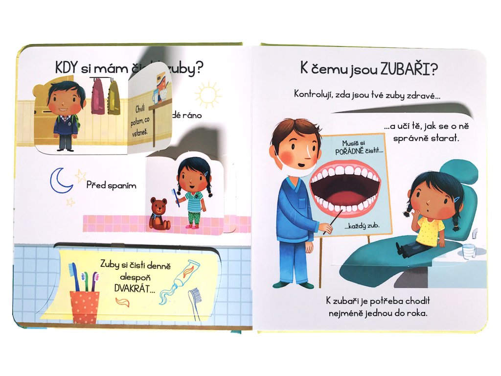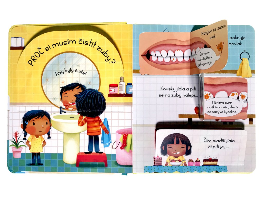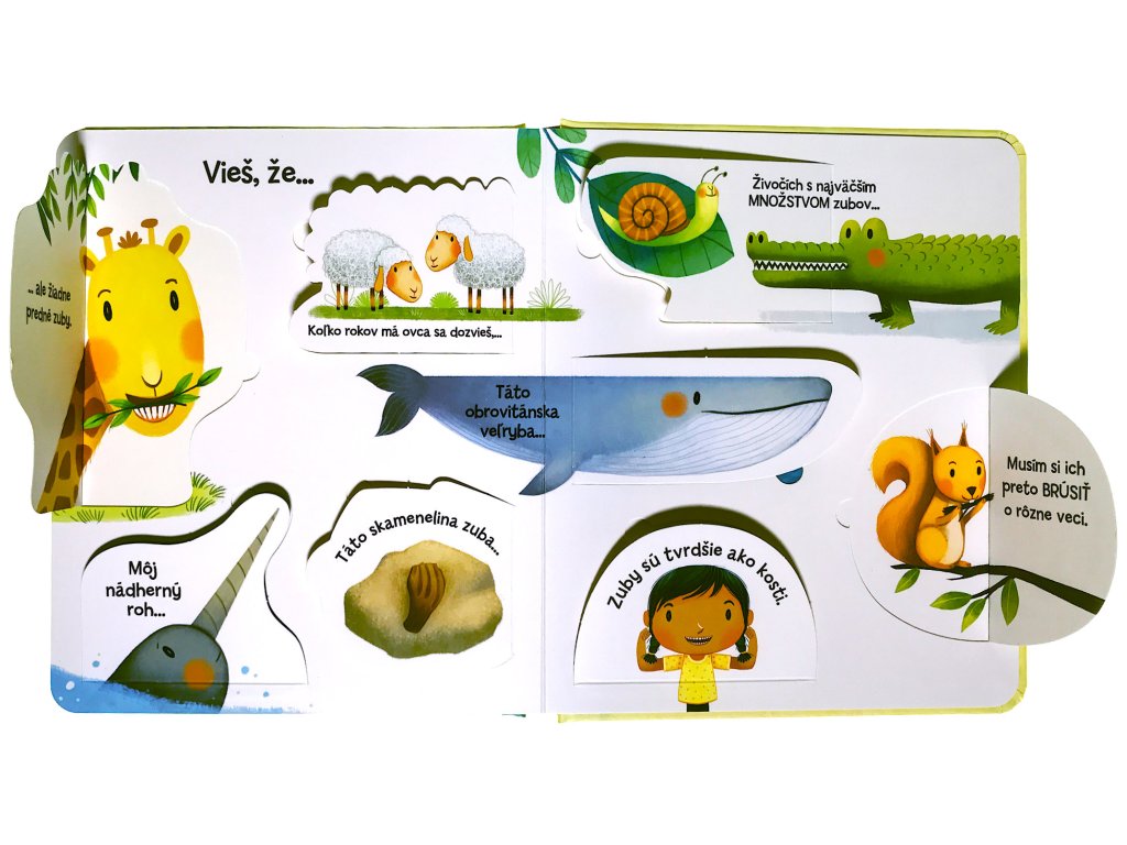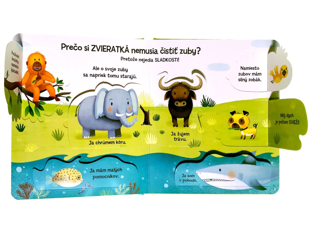 Nechce si vaše dítě čistit zuby? Bojí se zubařů? A co když vytáhne ten nejtěžší kalibr: "Zvířátka si taky nemusí čistit zuby!" Tato ilustrovaná knížka s odklápěcími okénky obsahuje odpovědi na nejčastější otázky dětí o zubech. Vysvětluje, k čemu jsou zuby dobré, proč dětem vypadávají, proč je důležité se o ně správně starat a chodit pravidelně k zubaři. A vysvětluje i to, že se zvířátka také o svůj chrup starají, i když nemají žádný kartáček. Díky tomuto krásně ilustrovanému leporelu už bude ranní a večerní hygiena jedna velká zábava!Doplňkové parametry