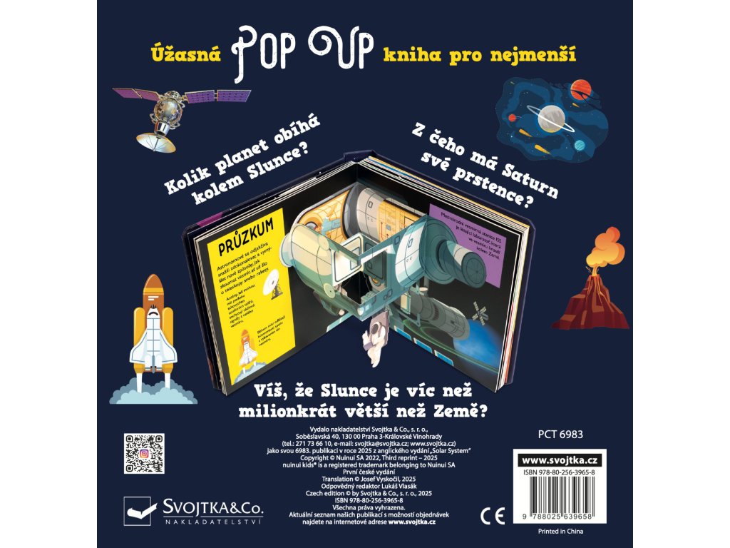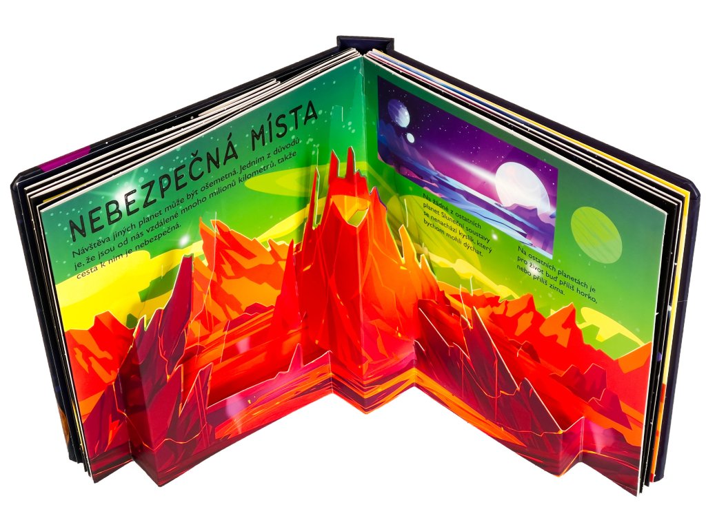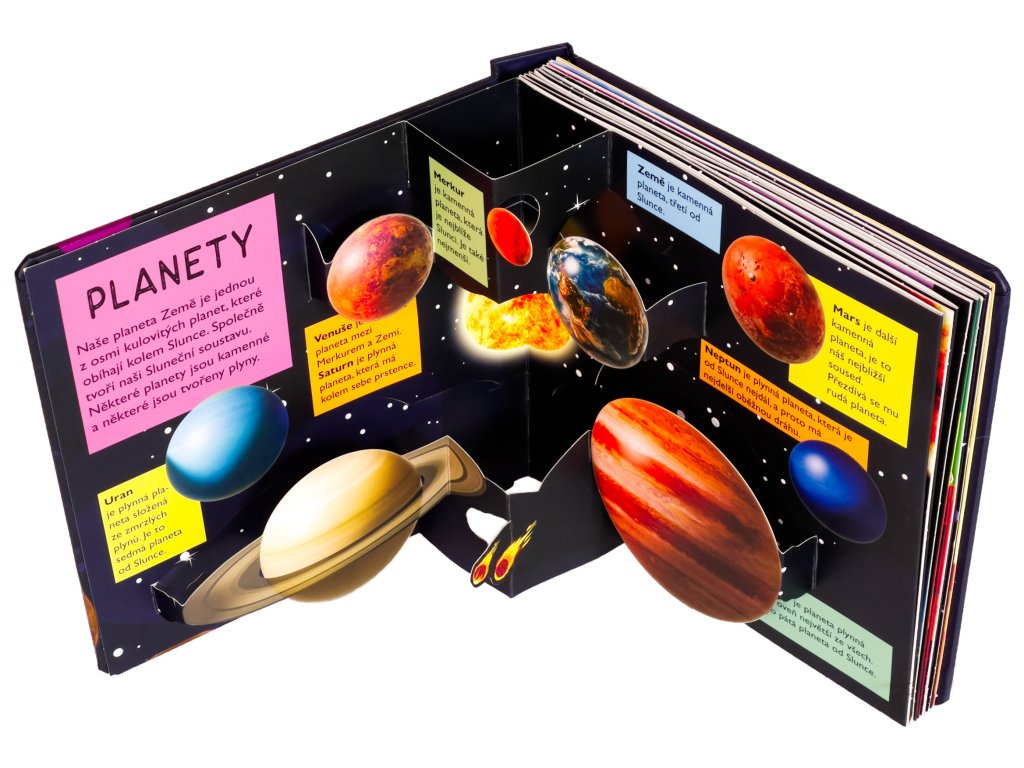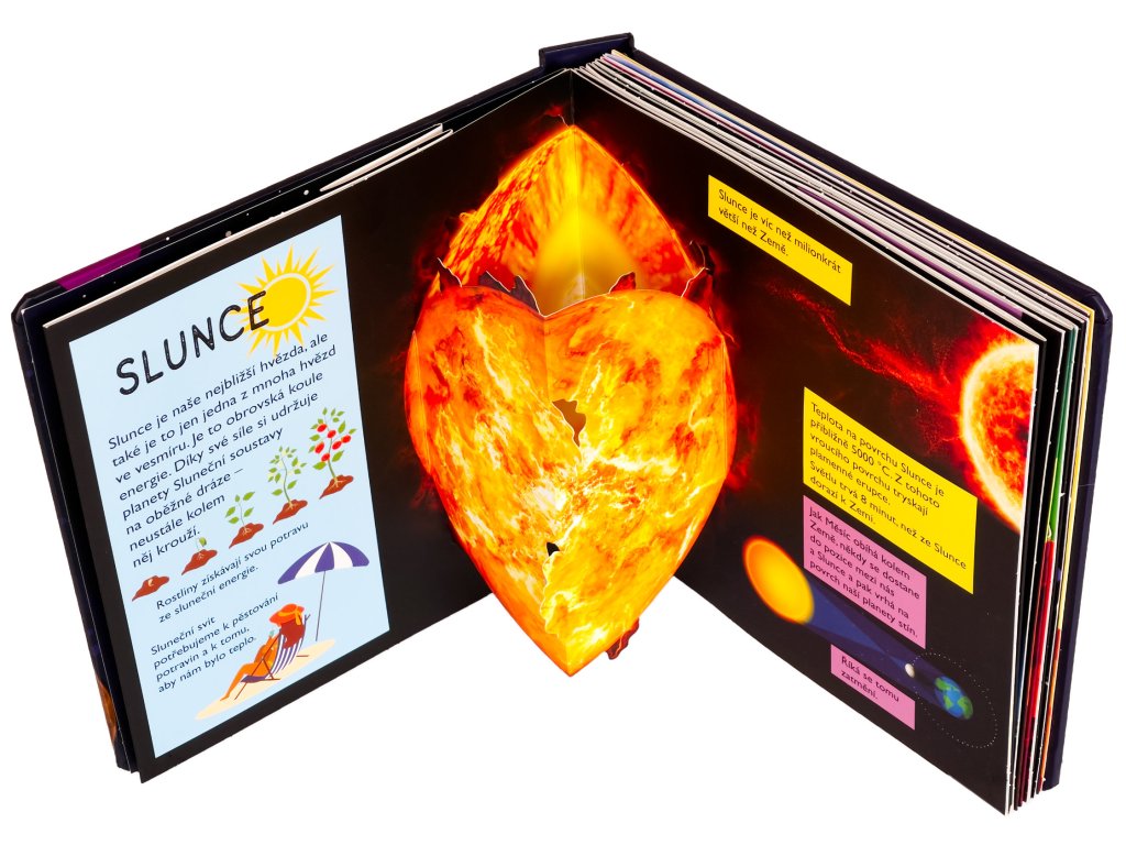 Kolik planet obíhá kolem Slunce? Z čeho má Saturn své prstence? Víš, že Slunce je víc než milionkrát větší než Země? Vstup do této krásně ilustrované knihy se spoustou prostorových pop-up obrázků a najdeš na tyto otázky odpovědi a dozvíš se i mnoho dalšího! Kniha je určena pro nejmenší děti, které se díky ní seznámí s naší Sluneční soustavou, planetami, Sluncem, Měsícem i s průzkumem vesmíru a poznají zázračnou planetu Zemi. Pro malé děti jsou pop-up obrázky ideální, protože do nich mohou doslova vstoupit a vše si lépe a názorně představit. Toto interaktivní a hravé zpracování ve vašich dětech jistě vzbudí zájem a udrží pozornost na dlouhé hodiny.Doplňkové parametry
