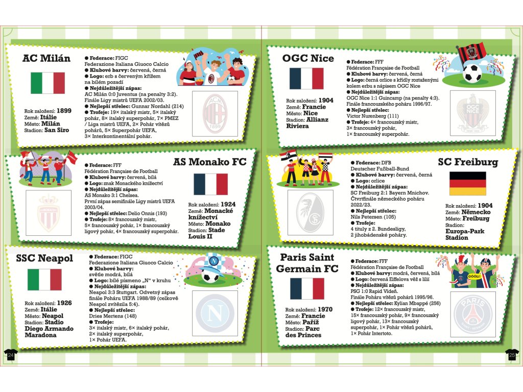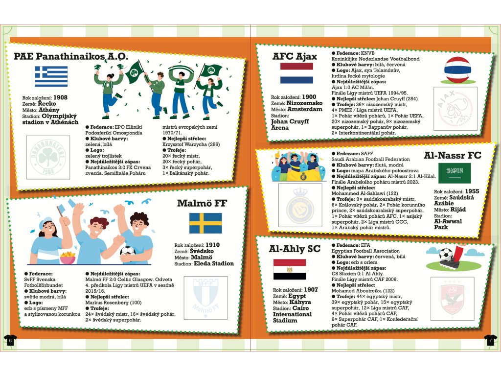V této knížce se dozvíte spoustu věcí o 80 vybraných fotbalových klubech z celého světa, od těch nejstarších až po takové, které vznikly teprve ve 21. století. U každého klubu najdete nejen základní geografické informace, ale také podrobnosti týkající se klubových barev a loga. Statistické údaje týkající se mužských týmů zahrnují jak nejlepší střelce a počty vstřelených gólů, tak i trofeje, které se klubu v průběhu historie podařilo získat. Seznámíte se také se základními pravidly fotbalu a s původem tohoto sportu. V neposlední řadě objevíte a dolepíte samolepky obsahující loga jednotlivých klubů, které informace obsažené v knize výborně doplňují.Doplňkové parametry