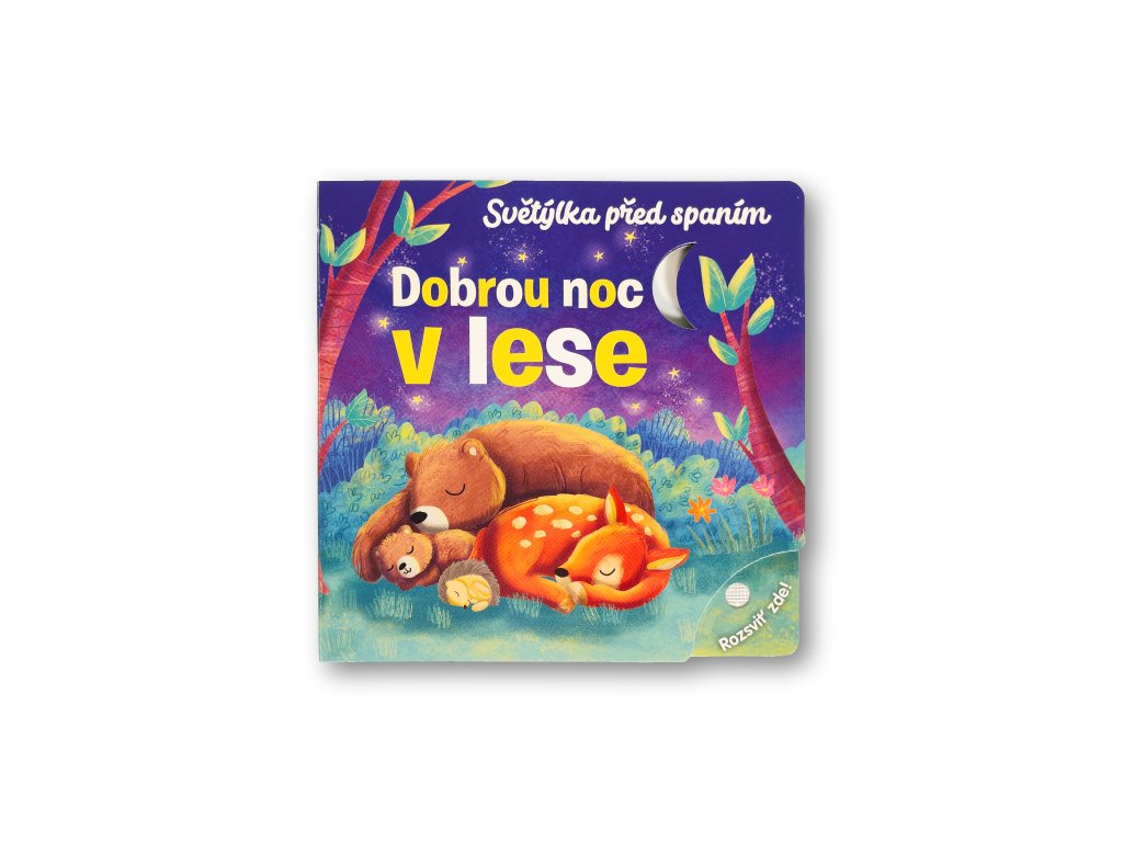 Když se na oblohu vyhoupne měsíc a rozsvítí se hvězdy, lesní zvířátka se chystají spát. Malá veverka se schoulí k mamince, ptáčata v hnízdě zavřou oči a v brlohu už podřimuje medvědí rodinka. Stiskni tlačítko, nech zářit měsíc a hvězdy a společně se sovou popřej dobrou noc všem lesním tvorům. Díky jemnému žlutému světlu je knížka vhodná pro klidné večery jako společné čtení před spaním. Výřezy v obrázku se s každou otočenou stránkou zvětšují, a tak světlo působí jasněji a umocňuje atmosféru.