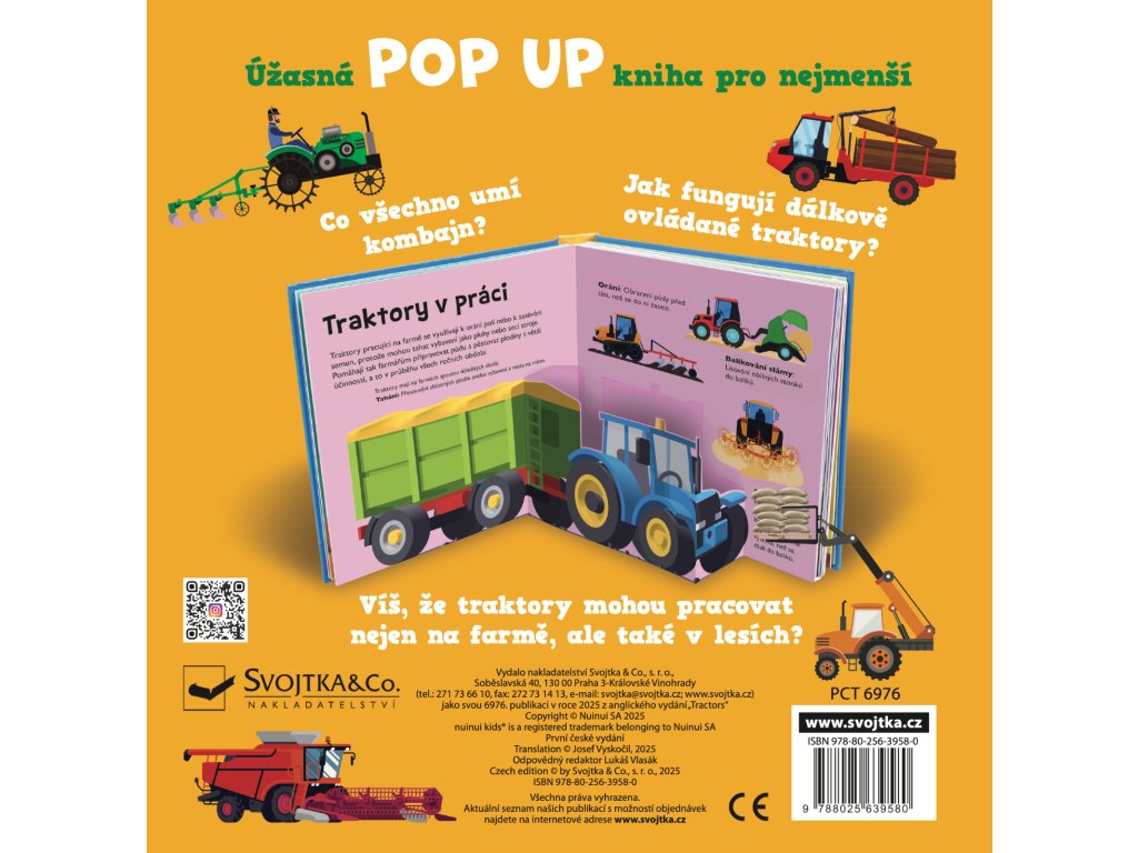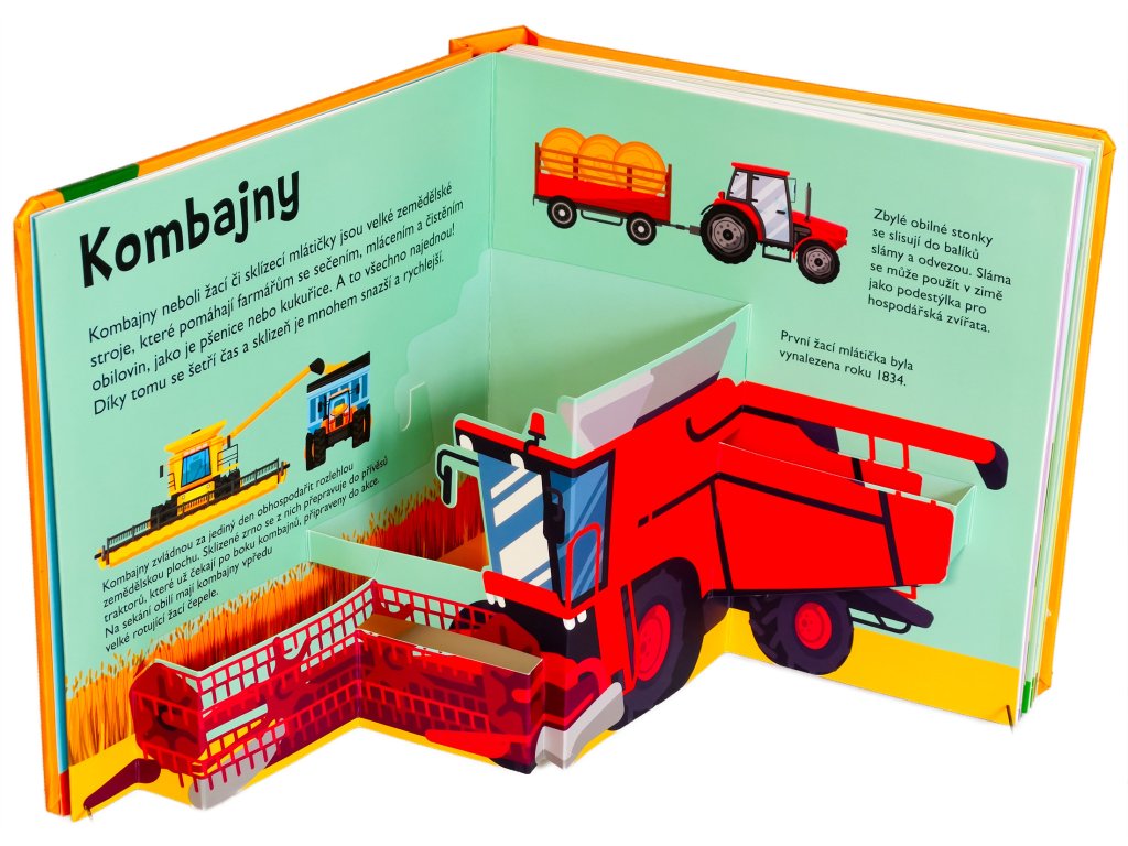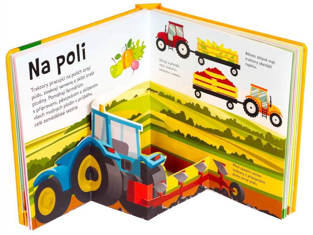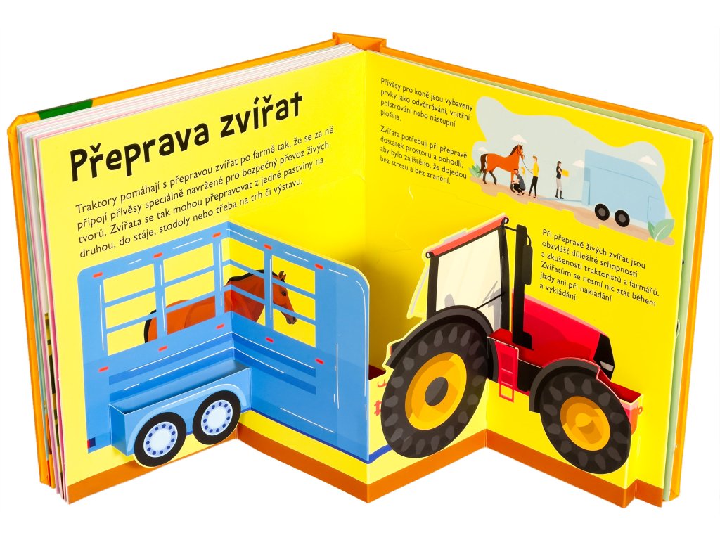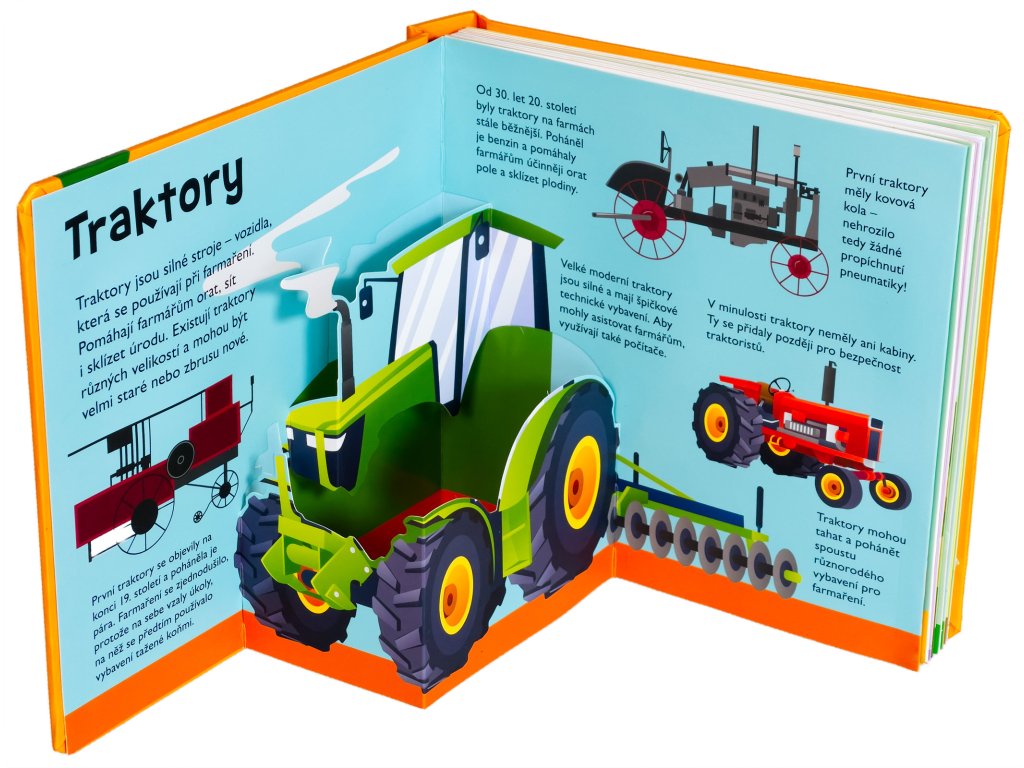 Víš, co všechno dokáže traktor, kde všude může pracovat a jak vypadá kombajn nebo vysokozdvižný vozík? Vstup do této krásně ilustrované knihy se spoustou prostorových pop-up obrázků a najdeš na tyto otázky odpovědi a dozvíš se i mnoho dalšího! Kniha je určena pro nejmenší děti, které se díky ní seznámí s různými druhy traktorů, jejich výbavou, prací na farmě, v lese nebo na stavbě. Pro malé děti jsou pop-up obrázky ideální - mohou do nich doslova vstoupit a všechno si představit názorněji a zábavněji. Interaktivní a hravé zpracování jistě vzbudí u vašich dětí zájem a udrží jejich pozornost na dlouhé hodiny.Doplňkové parametry