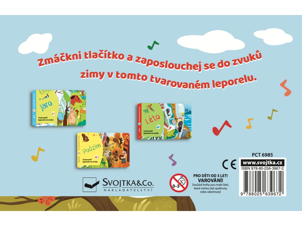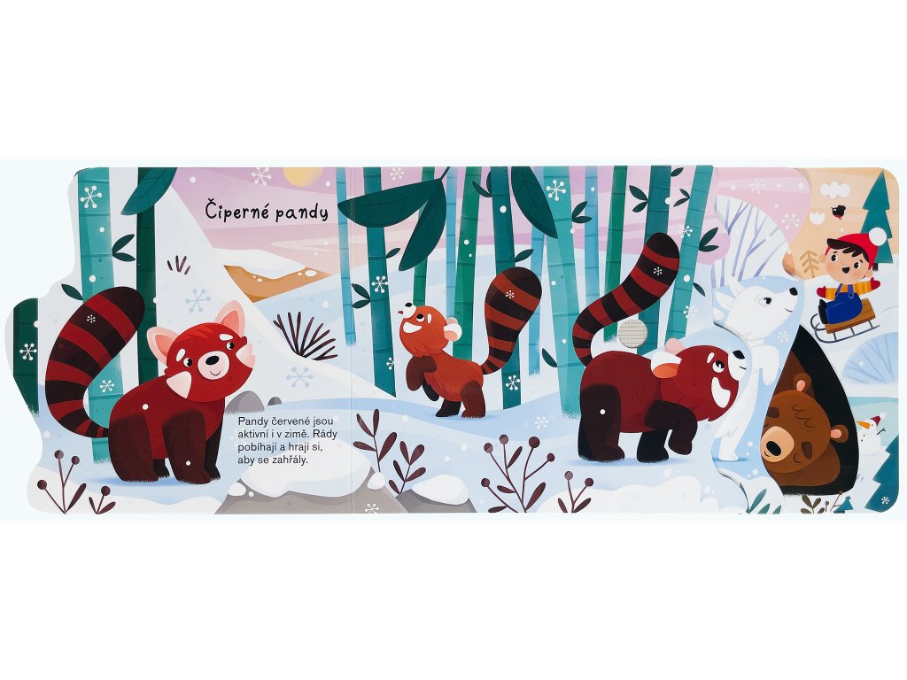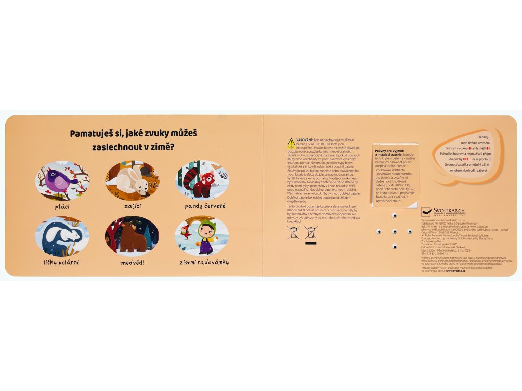 Objevujte fascinující svět přírody během zimy s tímto tvarovaným leporelem s výřezy plným zvuků! Děti se seznámí se zajíci, polárními liškami či medvědy. Stisknutím tlačítka si poslechnou realistické zvuky, které mohou zaslechnout v přírodě během zimy. Tato kniha je skvělou zábavou pro malé milovníky přírody, kteří rádi objevují a poznávají okolní svět.Doplňkové parametry