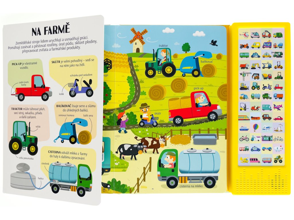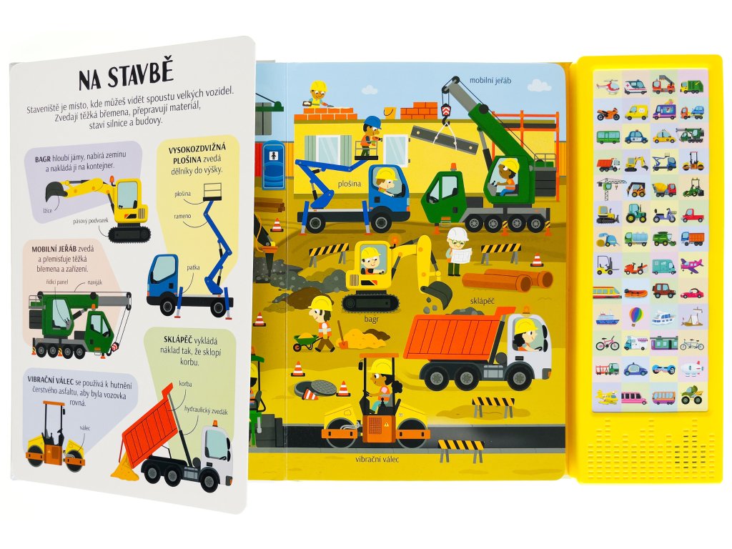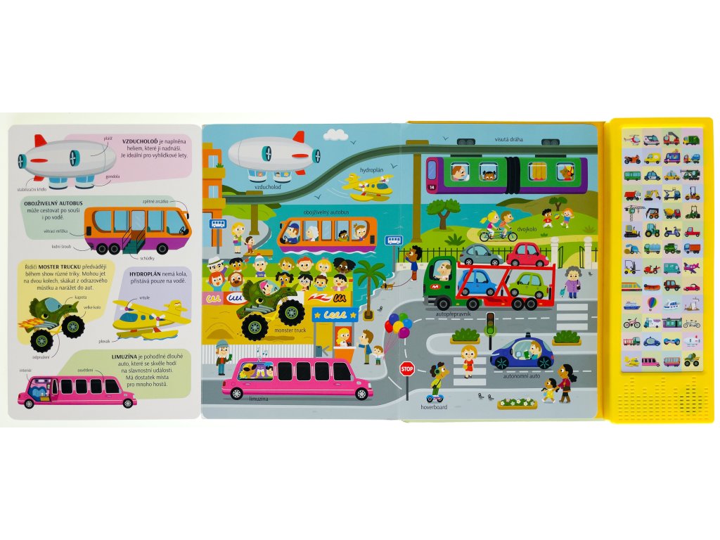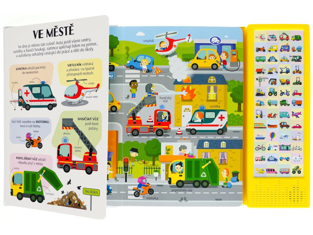 Dokážeš si představit náš svět bez dopravních prostředků? Zjednodušují nám život a jsou často velmi zajímavé. Vlak a autobus vozí cestující, bagr hloubí jámy na stavbě a hydroplán přistává na vodní hladině. Existují dopravní prostředky s křídly, koly a pedály nebo lodními šrouby. A těch zvuků, které vydávají! Tak neváhej, rozlož stránku, stiskni tlačítko a poslechni si název a zvuk, které vozidlo vydává. Prohlédni si obrázek, najdi vozidlo a v levé části si o něm přečti pár zajímavostí. Zvukový modul obsahuje 50 tlačítek se zvuky.Prodejní cena zvukové knihy již obsahuje recyklační poplatky.