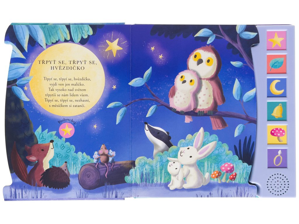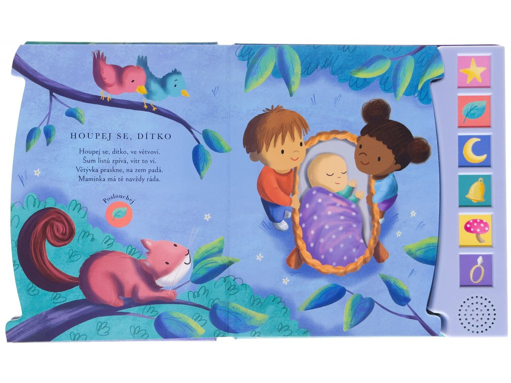 Knížka je nádherně ilustrovaná a obsahuje 6 známých ukolébavek. Syn 10 měsíců jí naprosto zbožňuje, takže u nás se čte a pouští i během dne.