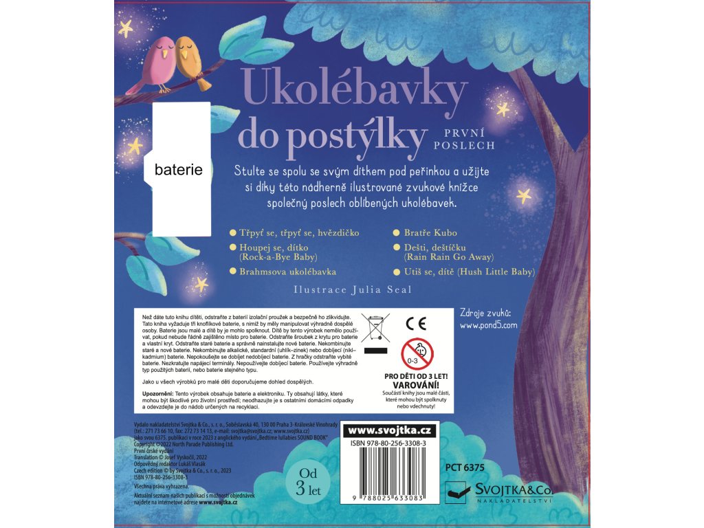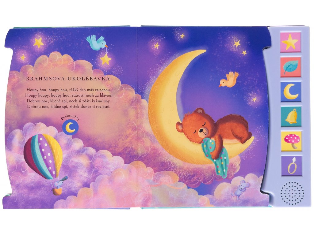 V této zvukové knížce na vás čeká šest známých klidných melodií, které jsou vhodné pro poslech v postýlce před usnutím. Najdete mezi nimi známé skladby jako Třpyť se, třpyť se, hvězdičko nebo Brahmsovu ukolébavku. Díky textům si budete moct ukolébavky se svým dítkem i zabroukat. Zachumlejte se pod peřinkou a užijte si společné chvíle poslechu díky této nádherně ilustrované zvukové knížce.Prodejní cena zvukové knihy již obsahuje recyklační poplatky.