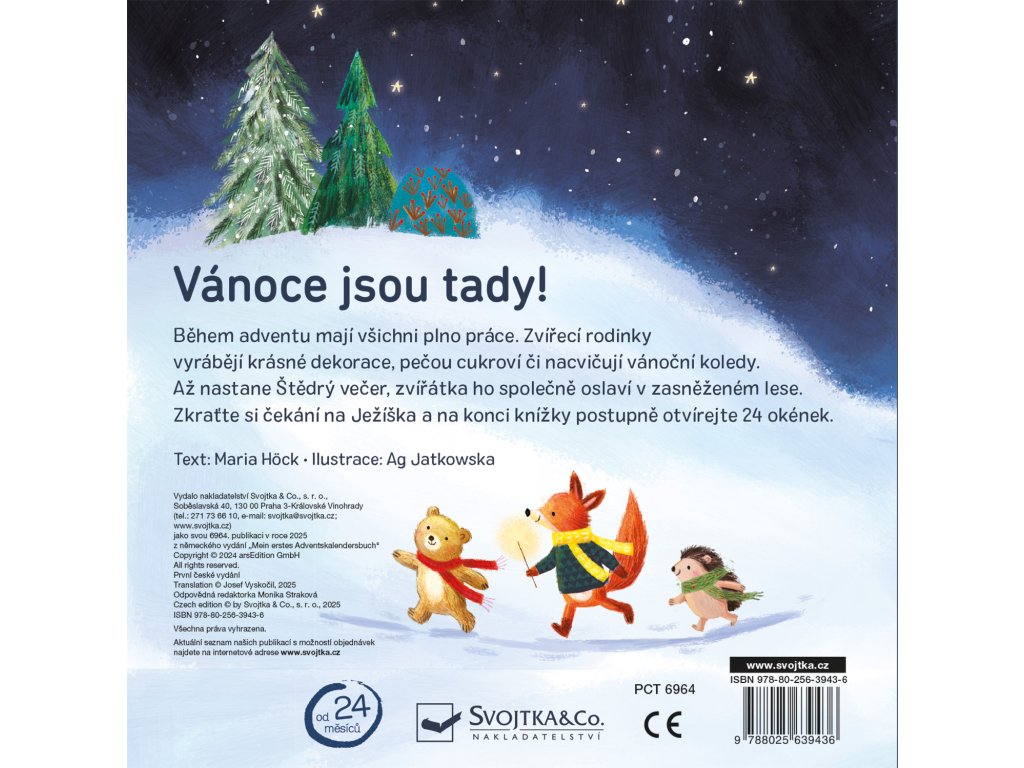 Během adventu mají všichni plno práce. Zvířecí rodinky vyrábějí krásné dekorace, pečou cukroví nebo nacvičují vánoční koledy. Až nastane Štědrý večer, zvířátka ho společné oslaví v zasněženém lese. Nahlédněte k zvířátkům do domečků a nechte se zahřát kouzelnou sváteční atmosférou. Zkraťte si čekání na Ježíška a na konci této vánoční knížky postupně otvírejte 24 adventních okének.Doplňkové parametry