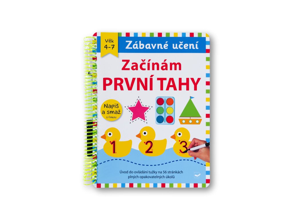 Tato interaktivní knížka na principu "Napiš a smaž" je ideálním pomocníkem pro děti od 4 do 7 let, které se učí ovládat tužku a připravují se na psaní. Čeká na ně 56 stran plných hravých úkolů - od dokreslování čar a tvarů, přes bludiště a spojovačky až po první písmena abecedy. Díky stíratelným stránkám a přiložené fixce lze úkoly plnit stále znovu, což podporuje trpělivost, jemnou motoriku a soustředění. Barevné ilustrace a veselé scény zvířátek, dopravních prostředků nebo zábavných her dělají z procvičování psaní parádní zábavu.
